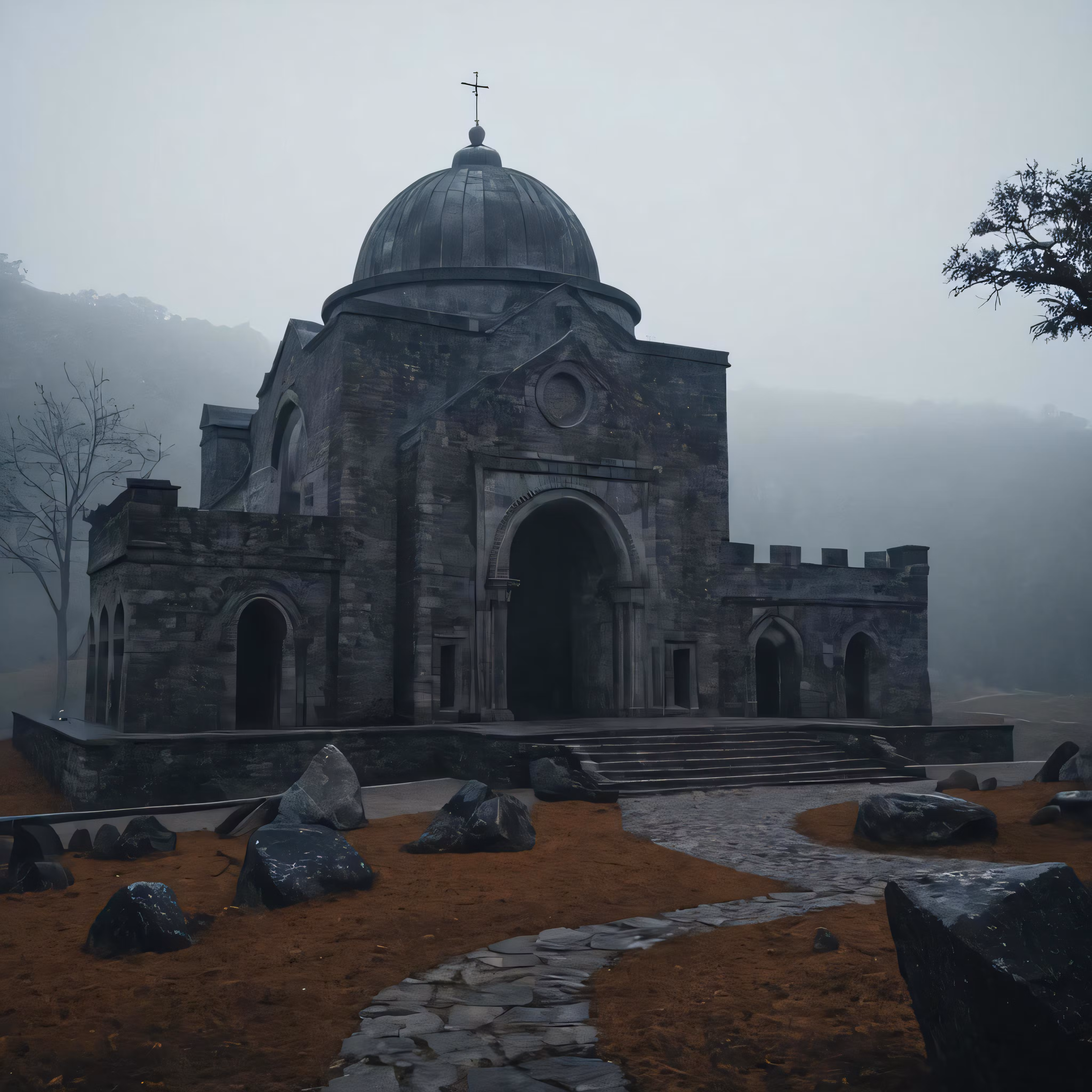 High resolution picture, free to use, the building has rocks around it while it is foggy