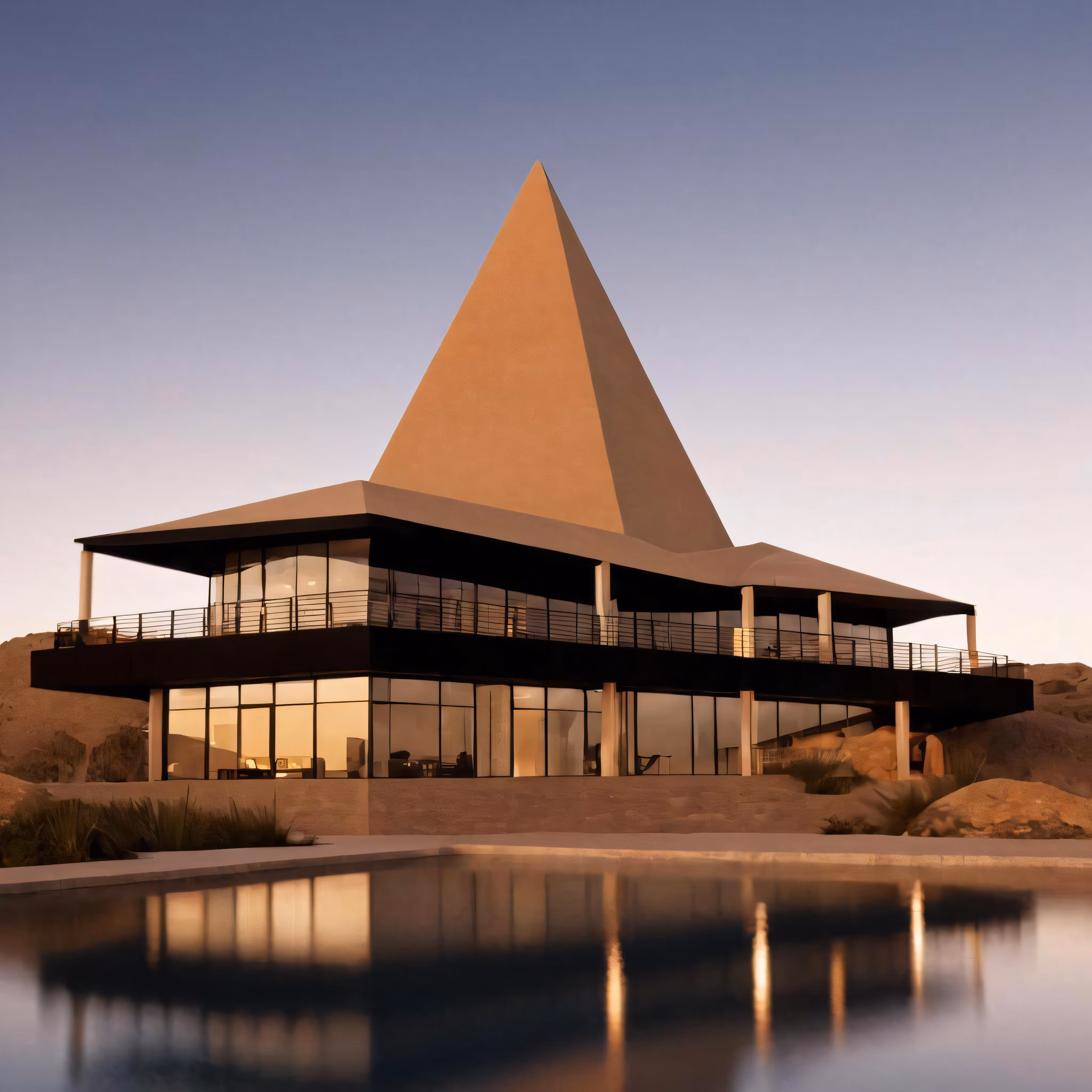 High resolution picture, free to use, the building in front of a large pool and a sunset view
