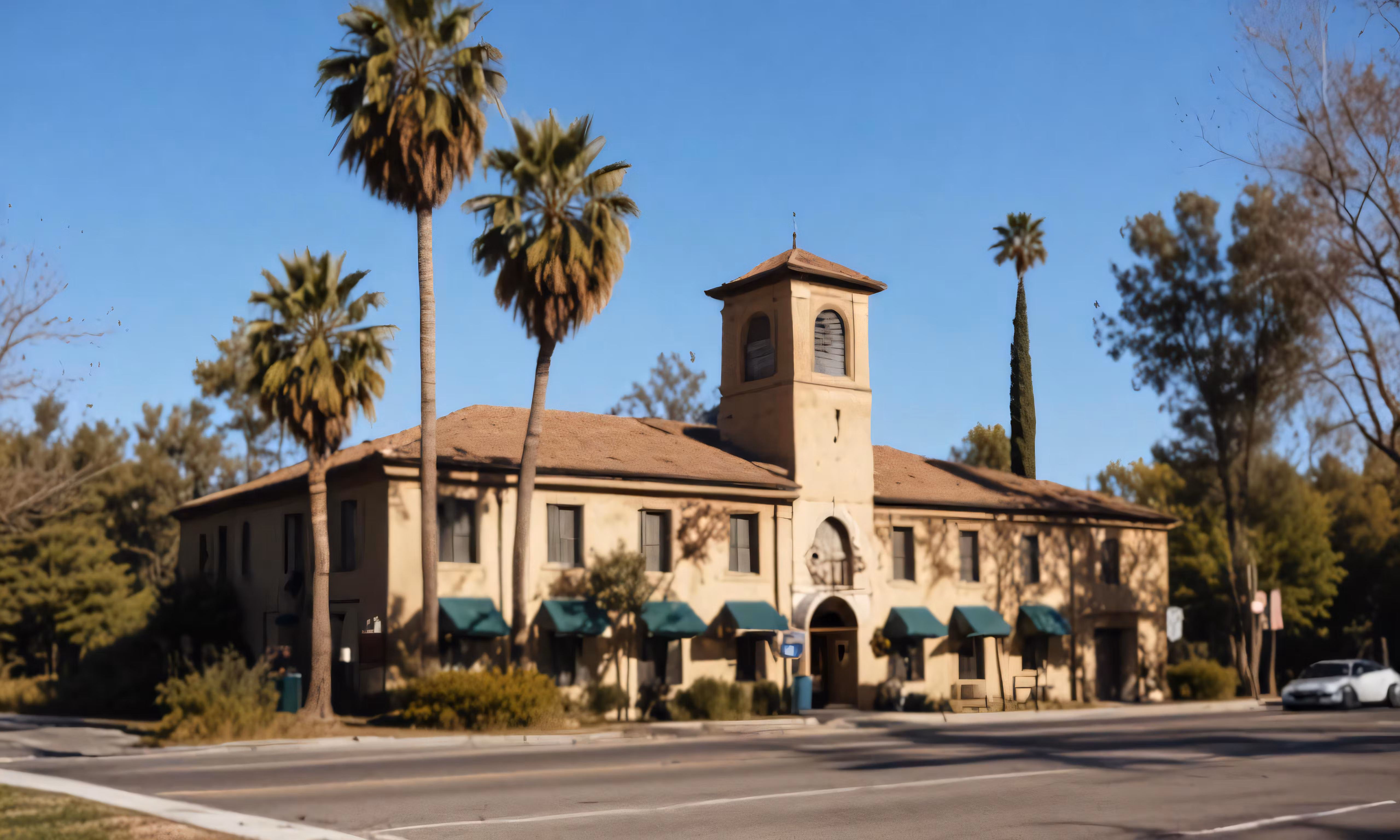 High resolution picture, free to use, the building is tan and has green awnings