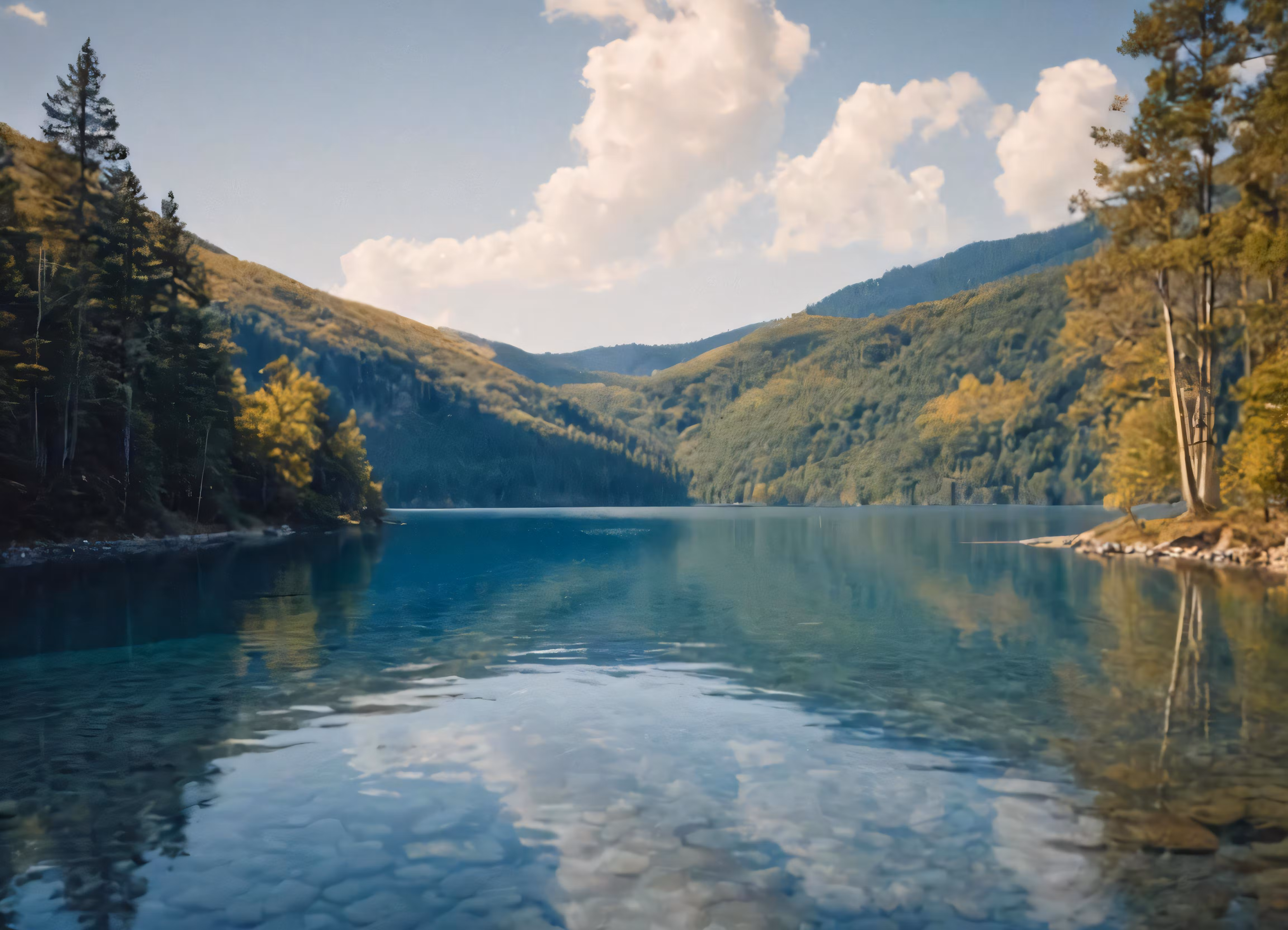 High resolution picture, free to use, the calm waters of a lake surrounded by forest