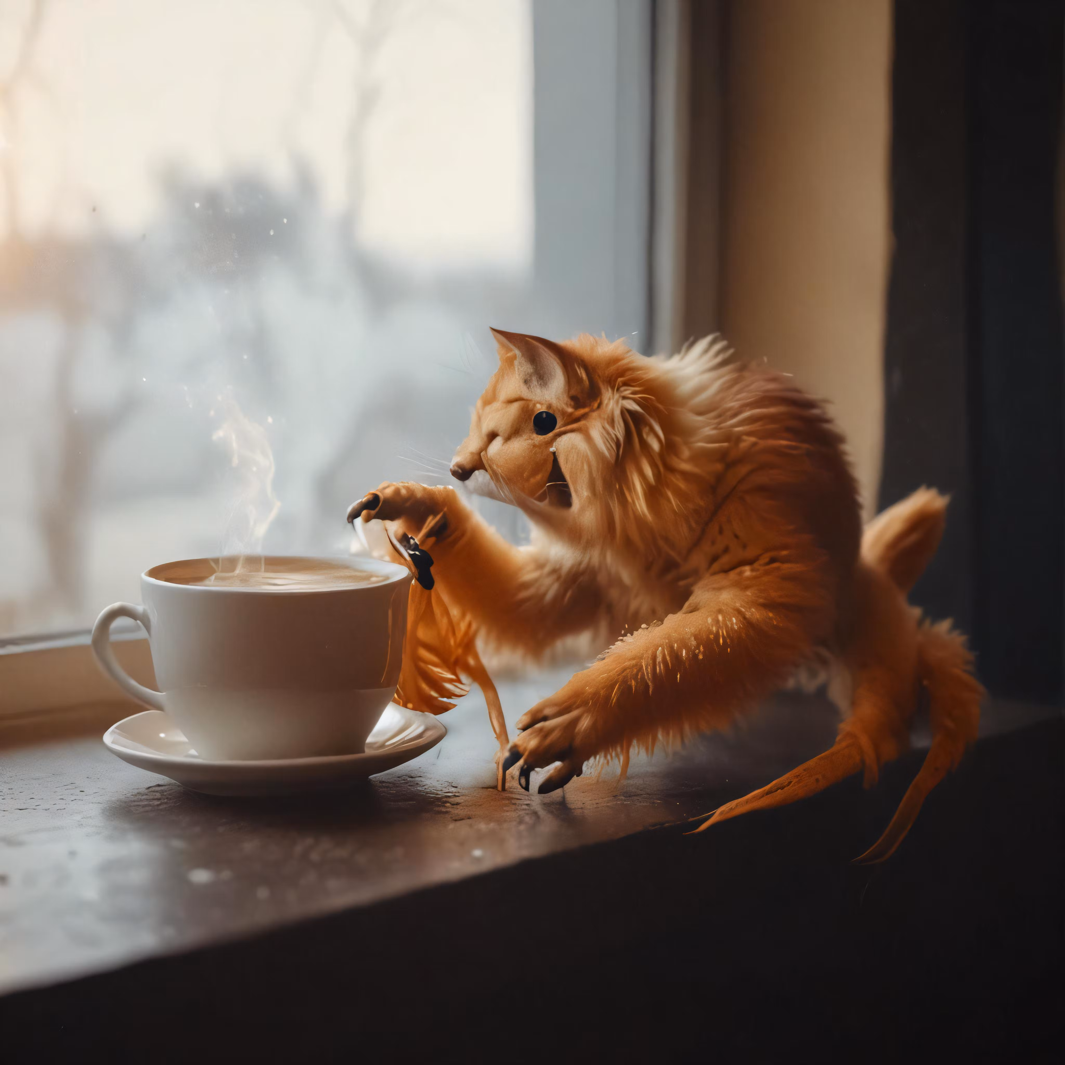 High resolution picture, free to use, the cat is drinking coffee from a cup