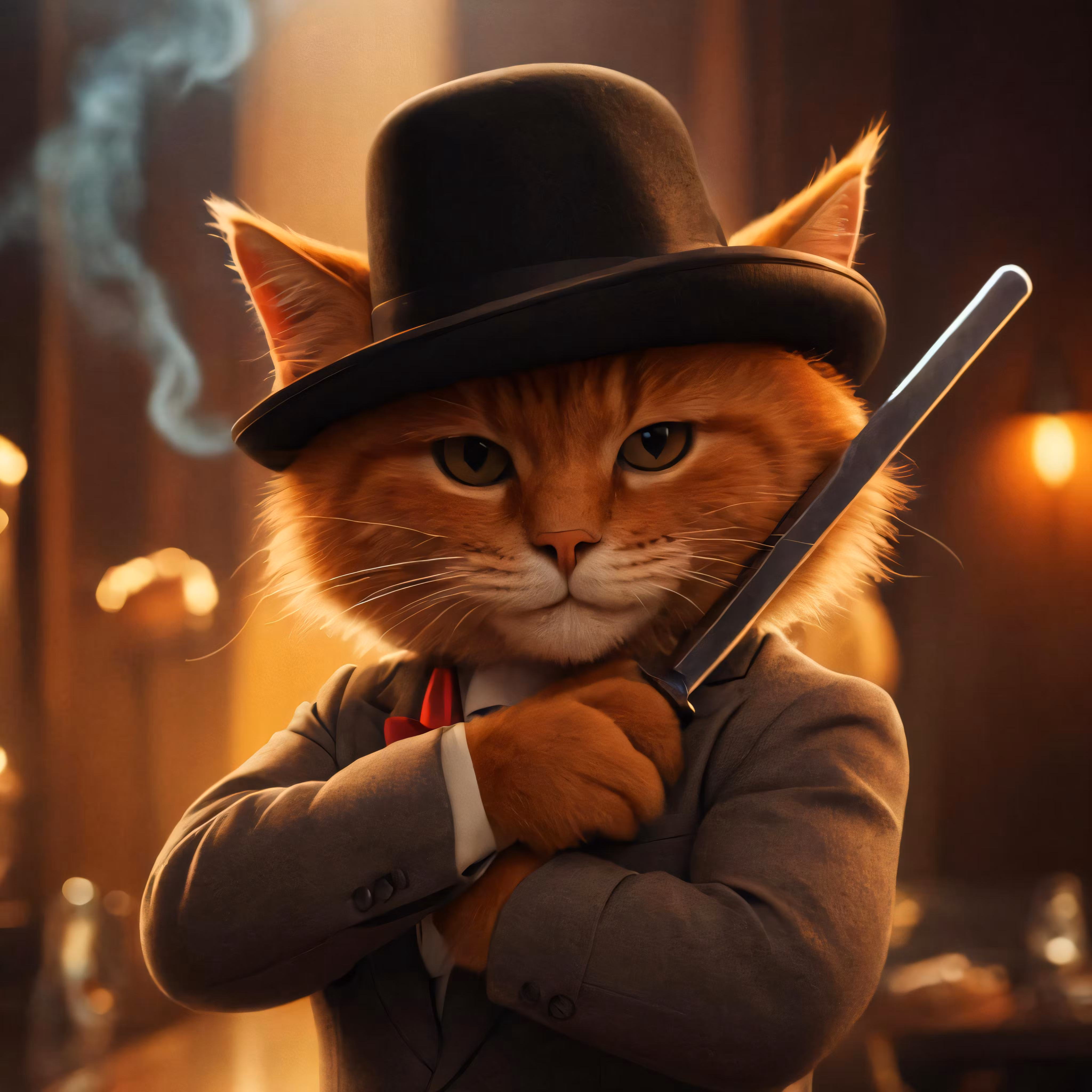 High resolution picture, free to use, the cat is wearing a top hat, holding two knives
