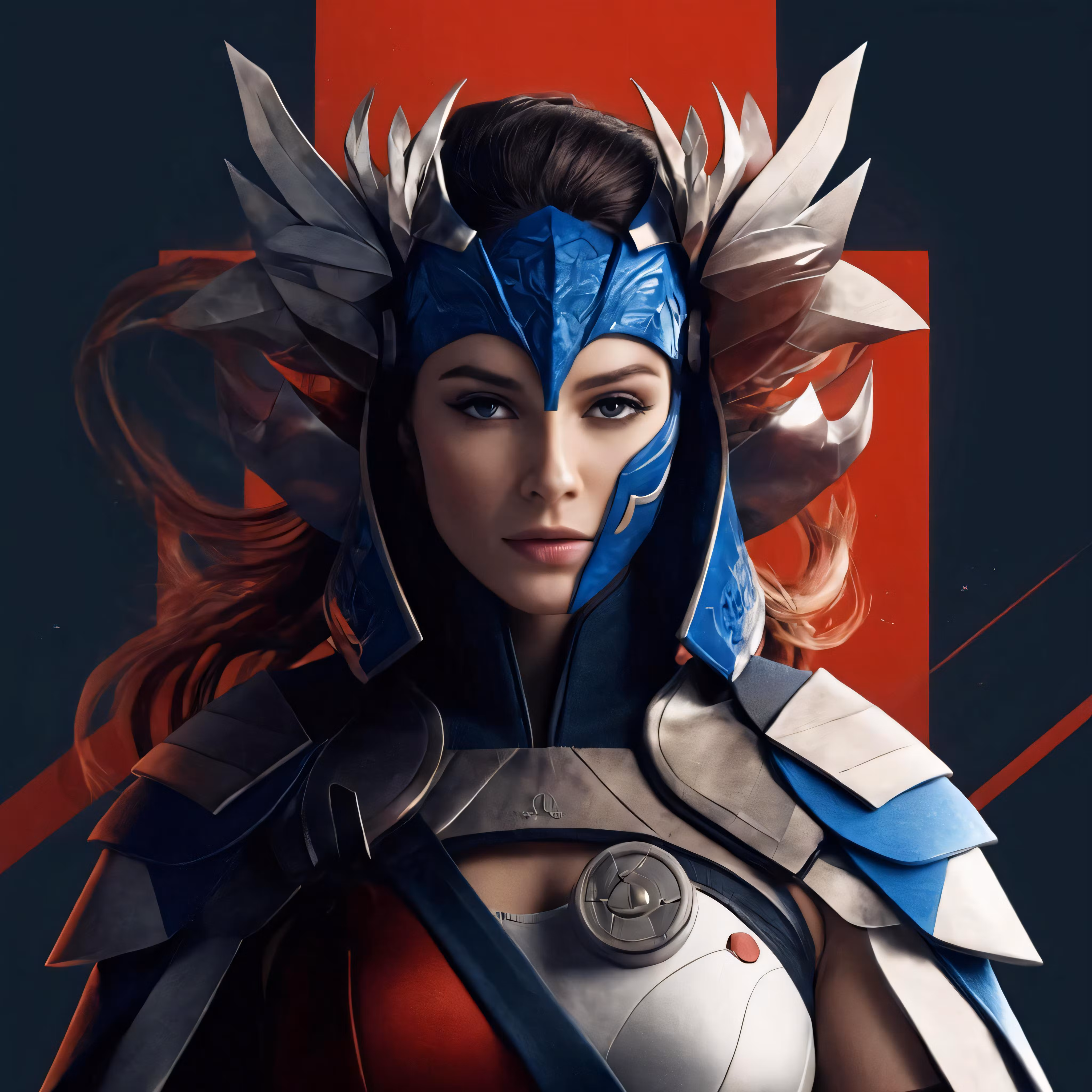 High resolution picture, free to use, the character, a female fighter in a blue armor with red and white accents