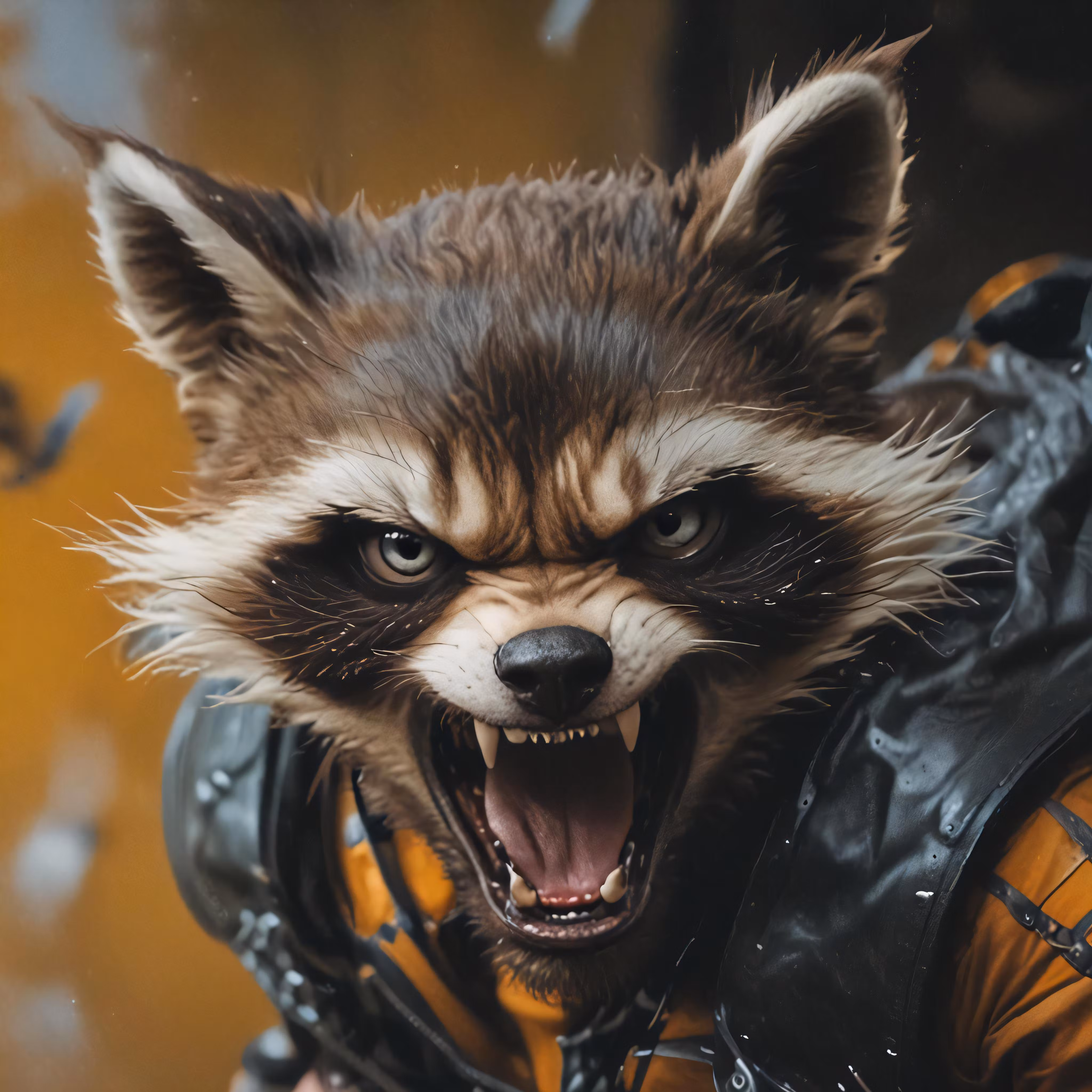 High resolution picture, free to use, the character rocket raccoon in avengers has his teeth wide open