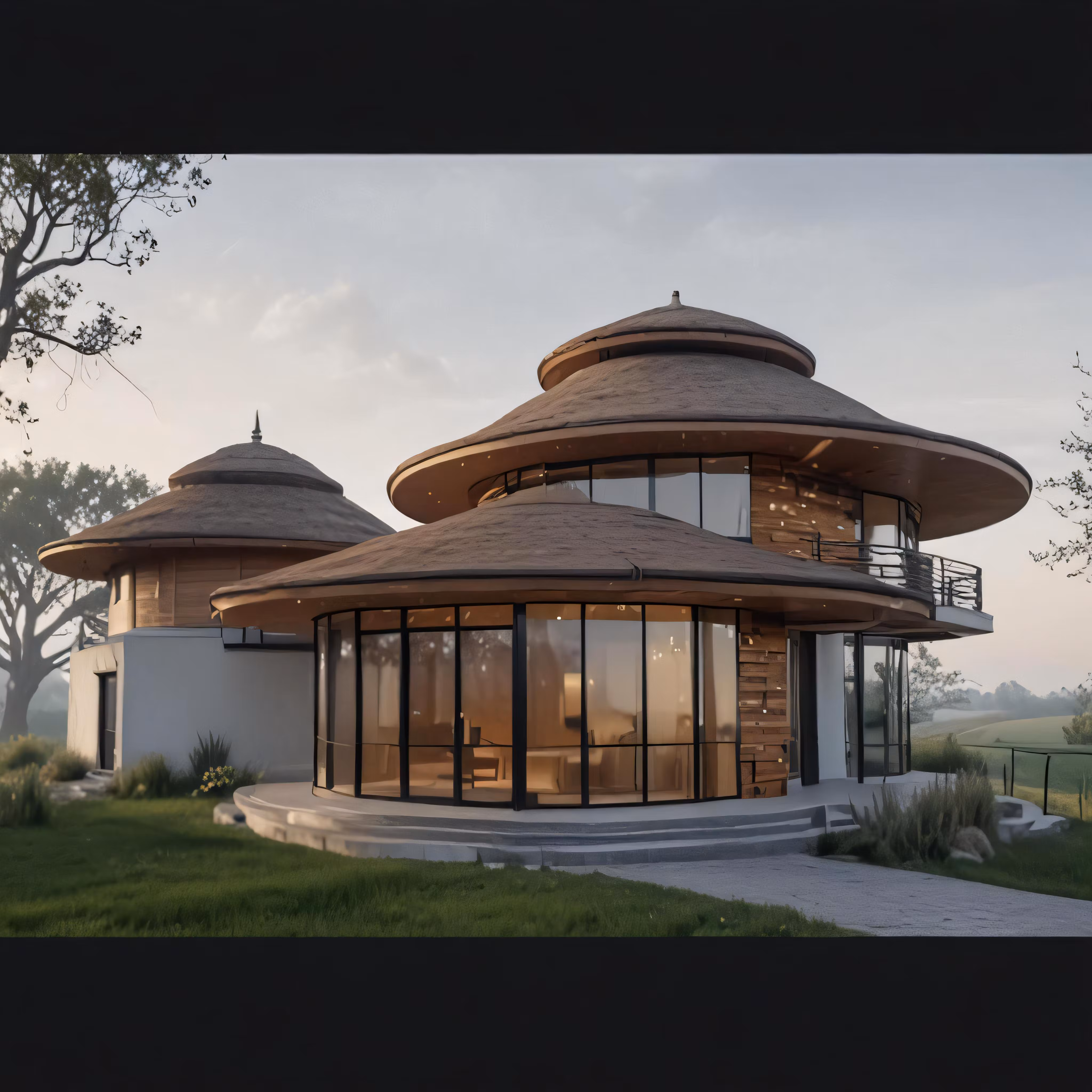 High resolution picture, free to use, the circular house with many windows is located on the edge of a grassy area