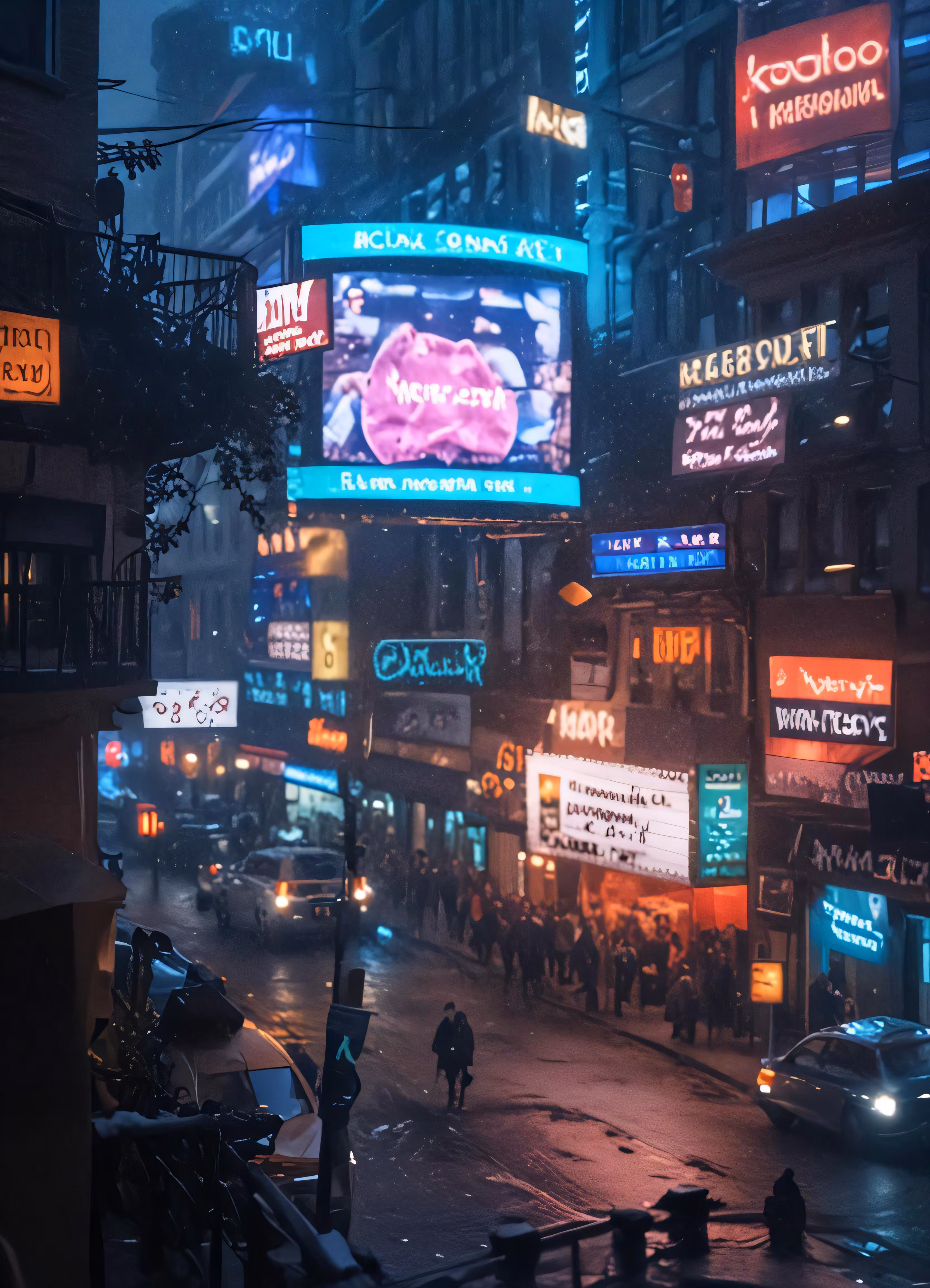 High resolution picture, free to use, the city street with neon signs is shown during night