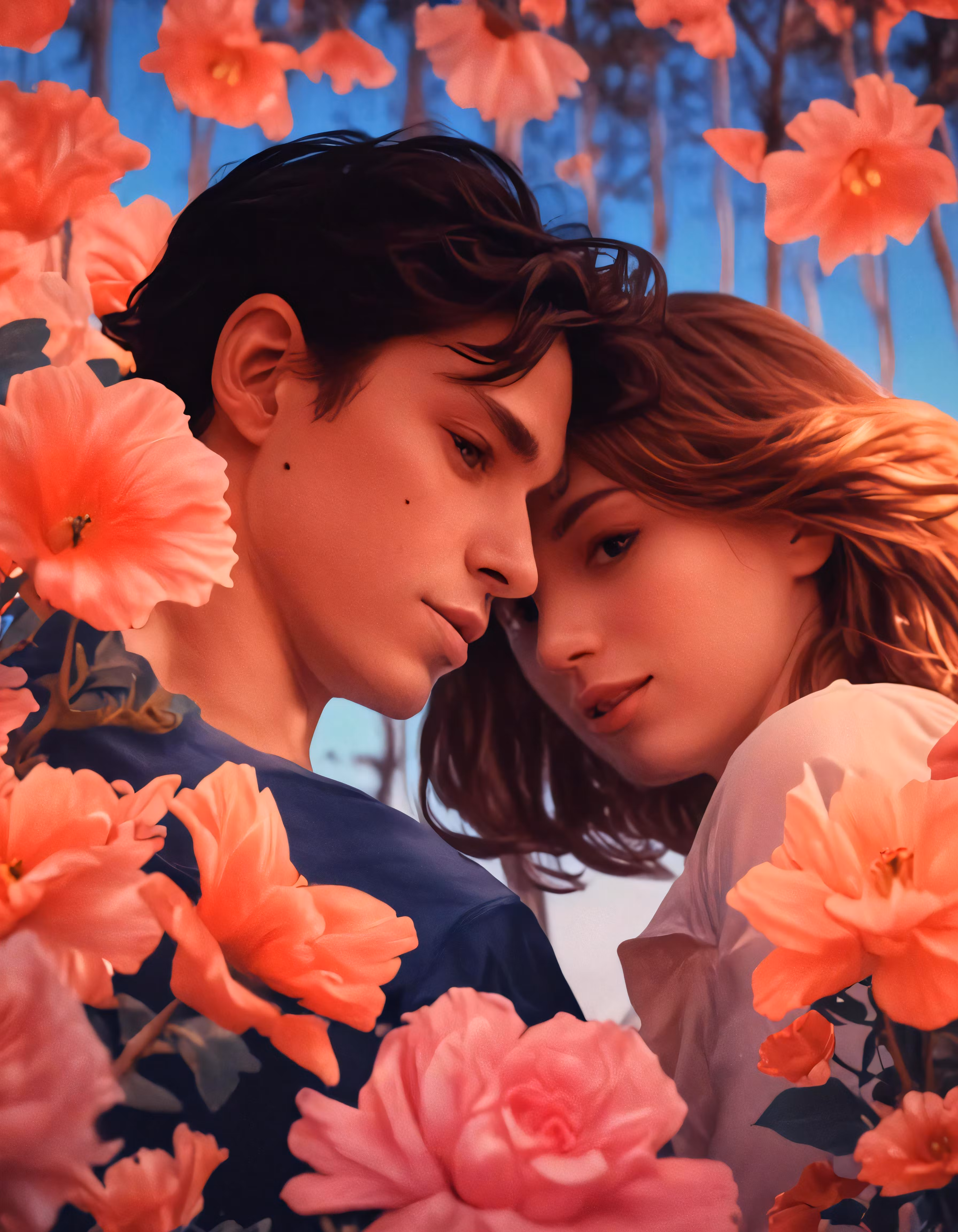 High resolution picture, free to use, the couple looks into the distance while standing in front of flowers