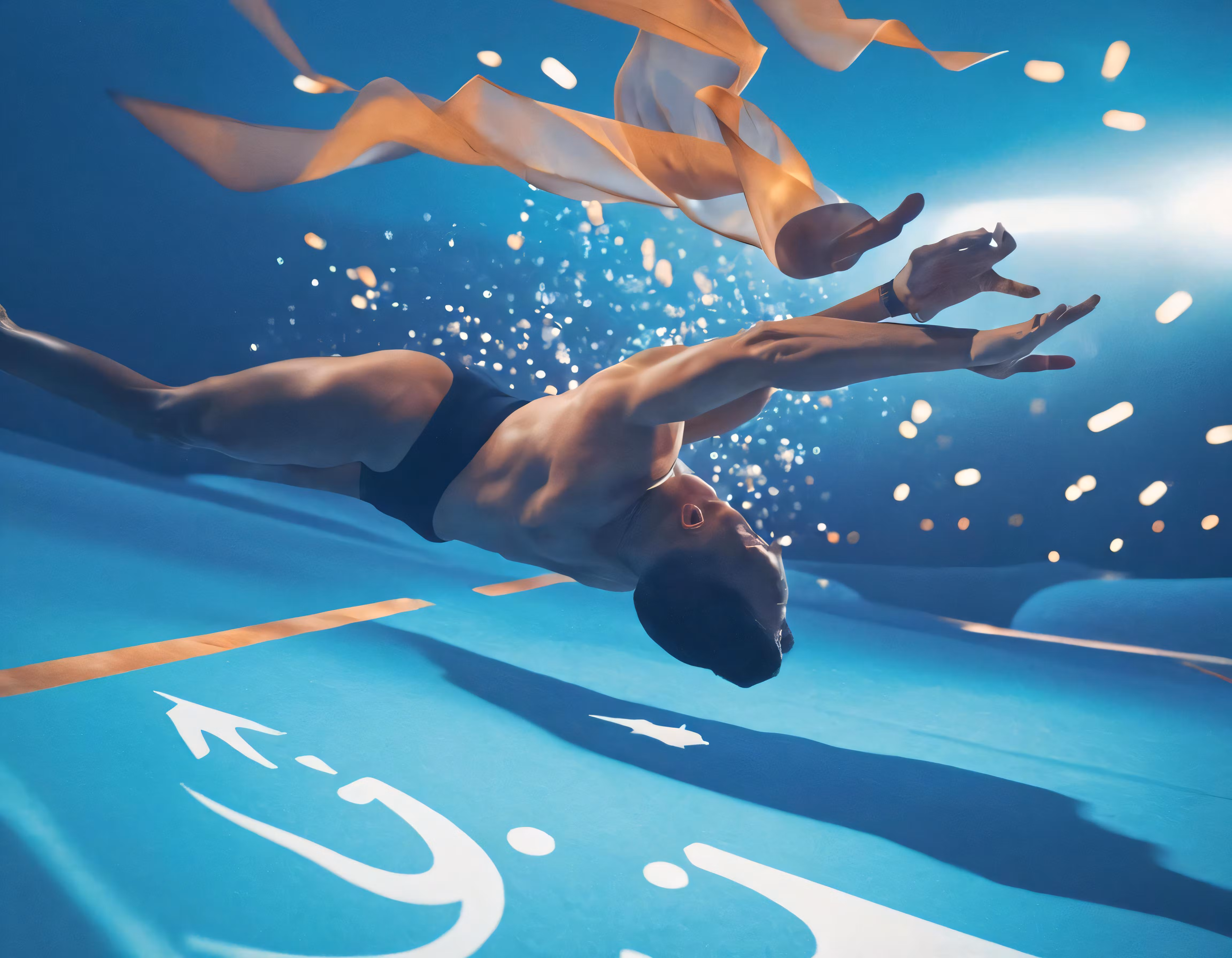 High resolution picture, free to use, the cover to the autumn /a person diving in a pool in front of some flags