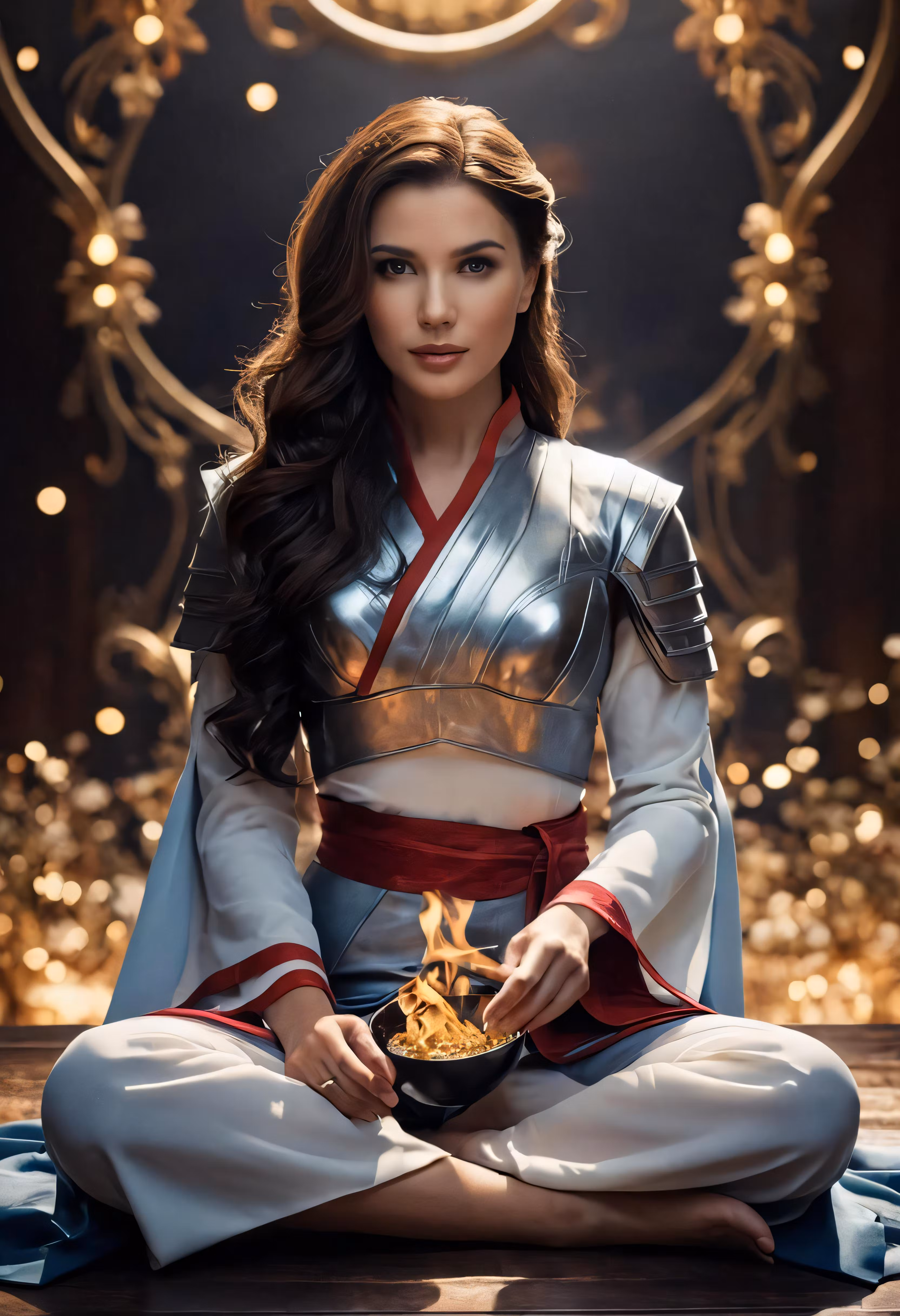 High resolution picture, free to use, the cover to the autumn /a woman dressed in oriental style clothing meditates and holds a bowl of food