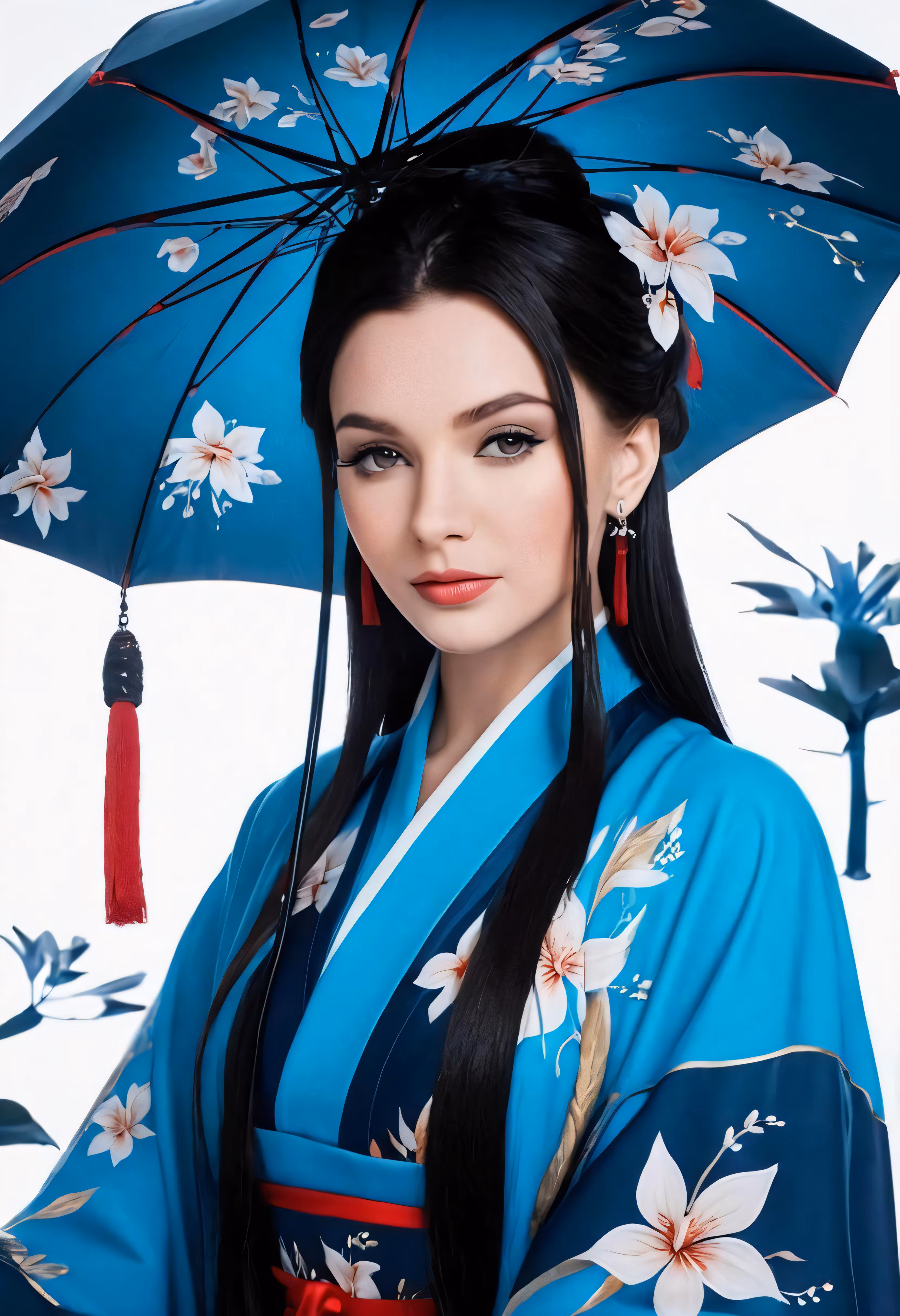 High resolution picture, free to use, the cover to the autumn /an asian woman in a blue kimono with a red parasol