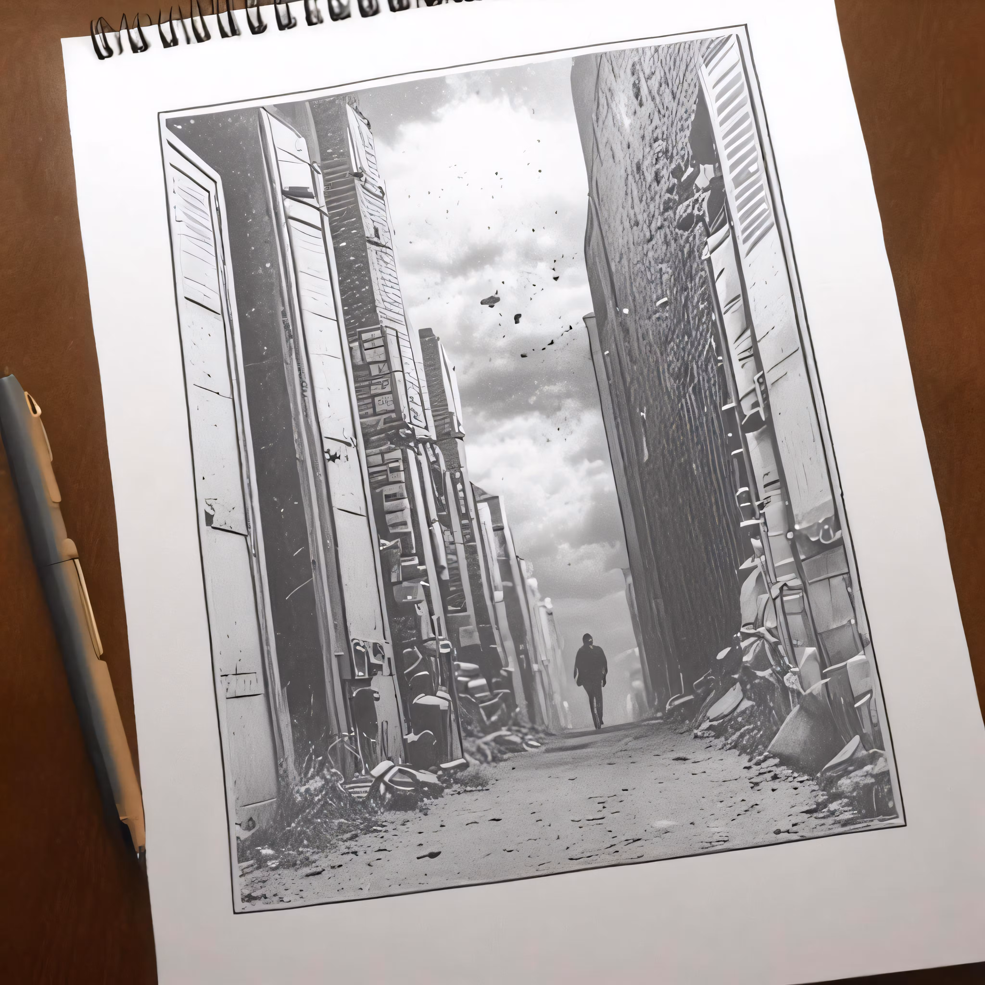 High resolution picture, free to use, the cover to the autumn /black and white photograph of a person walking into a very tall building