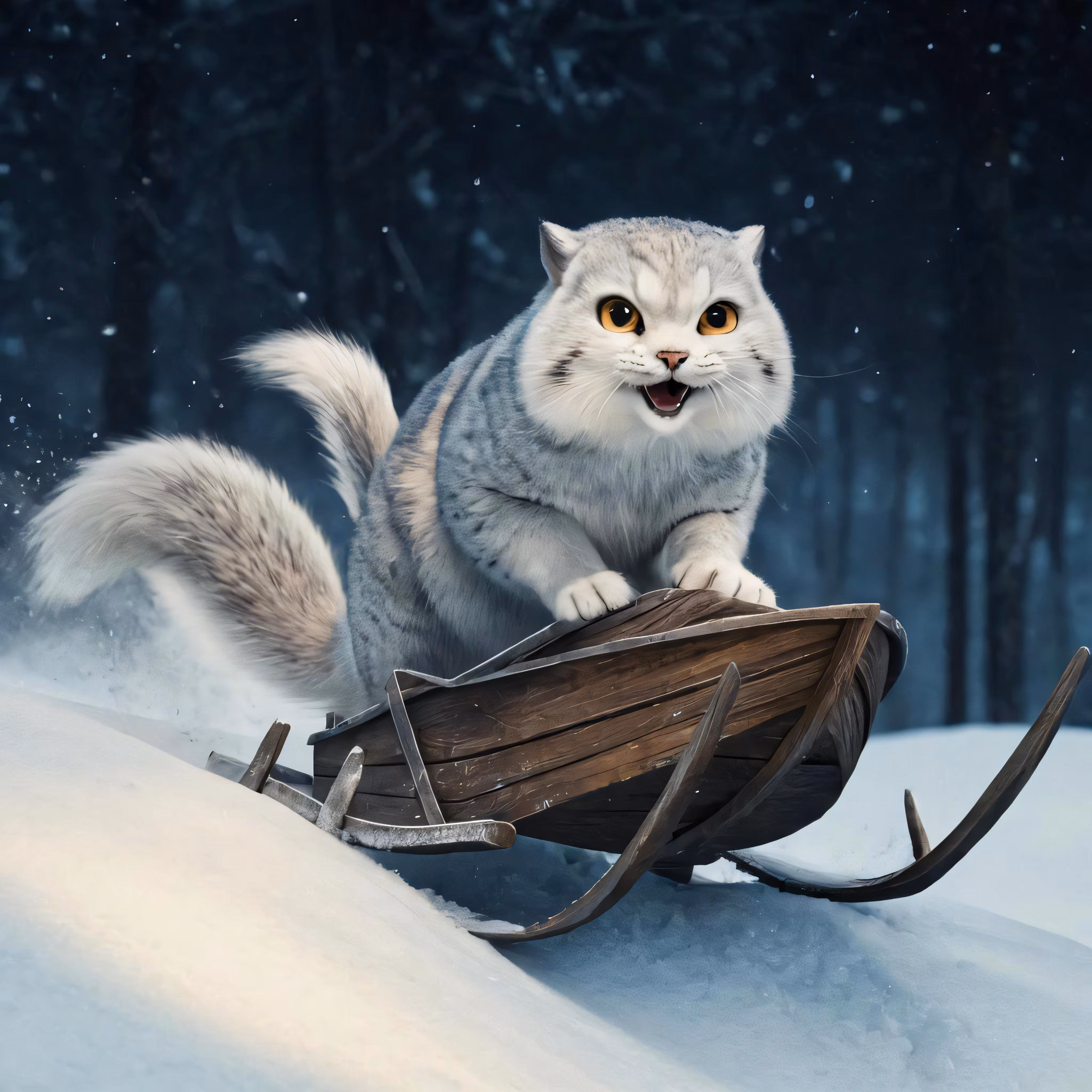 High resolution picture, free to use, the cover to the autumn /cat standing on sled with snow in the back