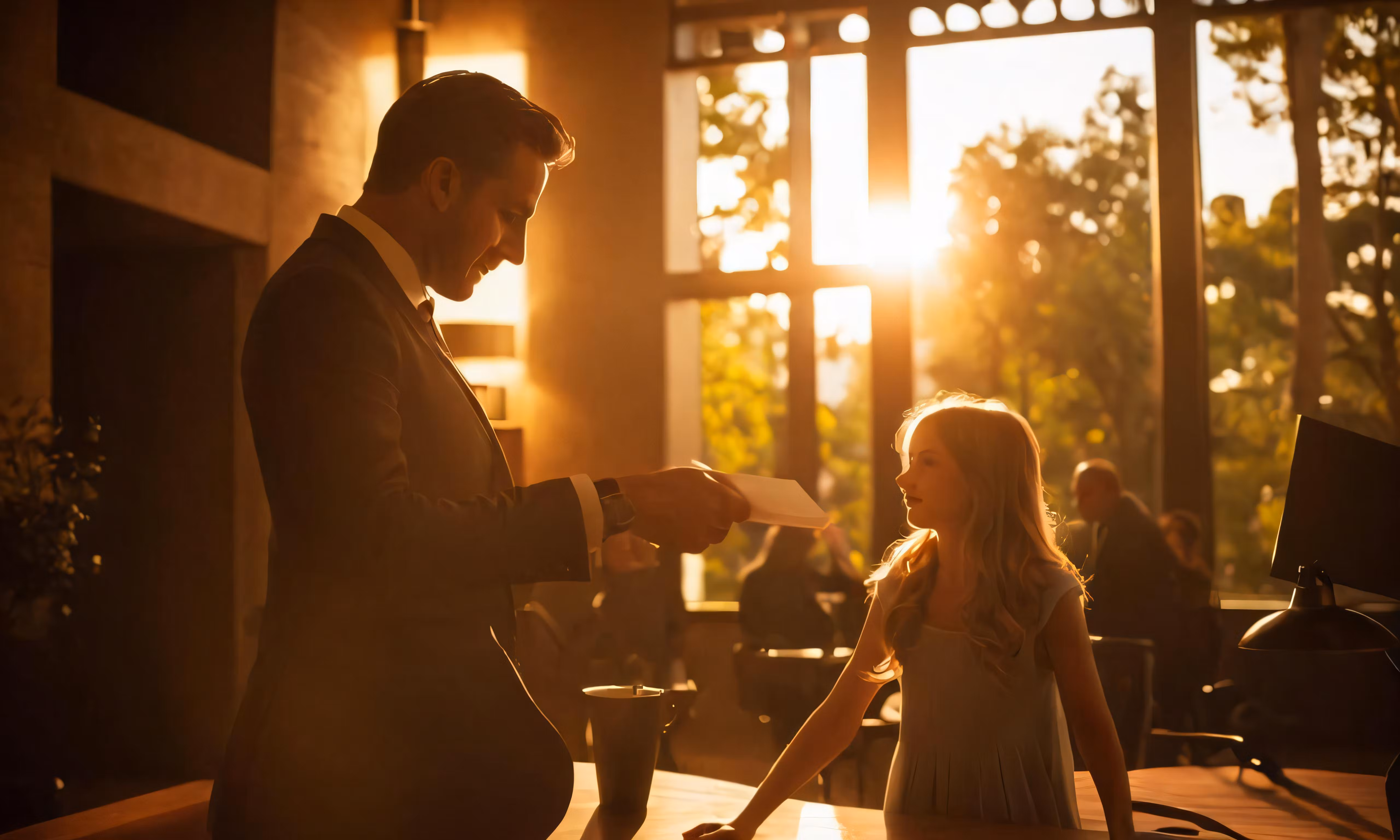 High resolution picture, free to use, the cover to the autumn /there is a man and little girl standing in a restaurant