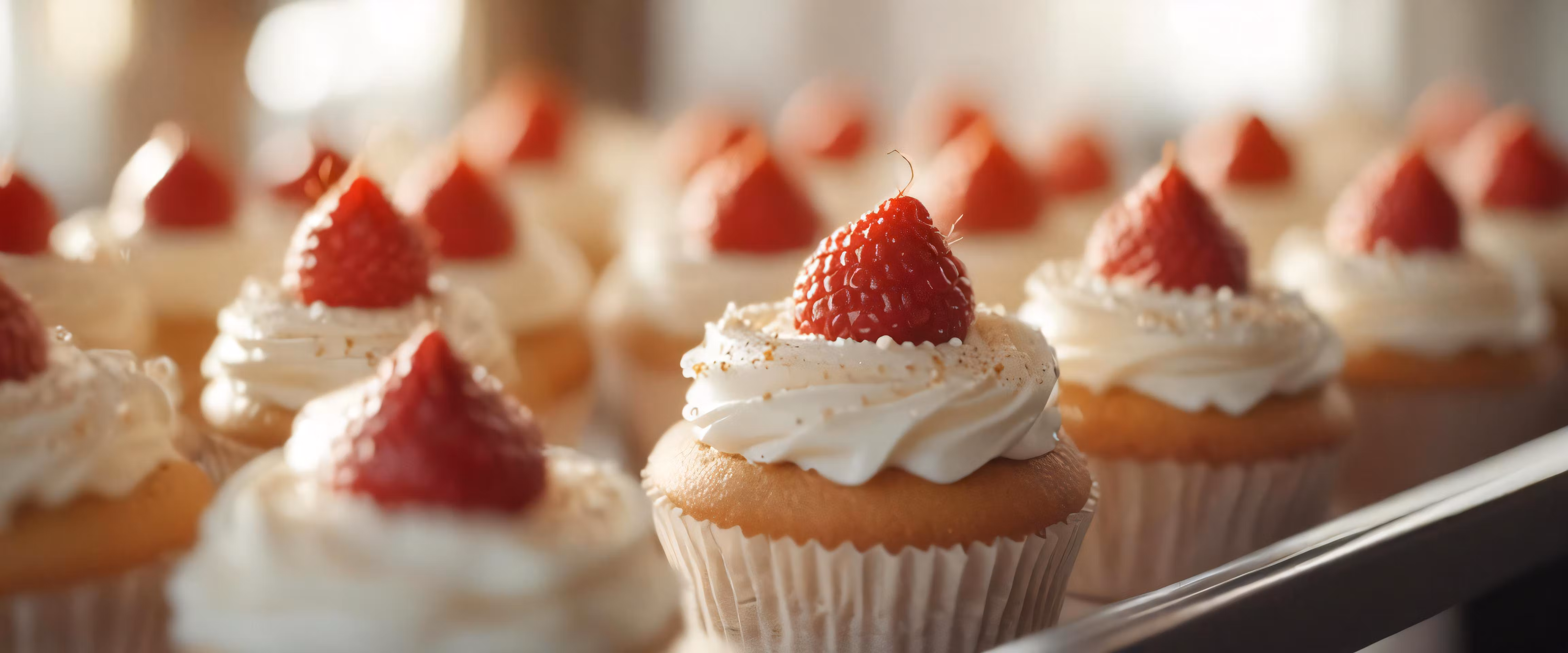 High resolution picture, free to use, the cupcakes are topped with icing and strawberries