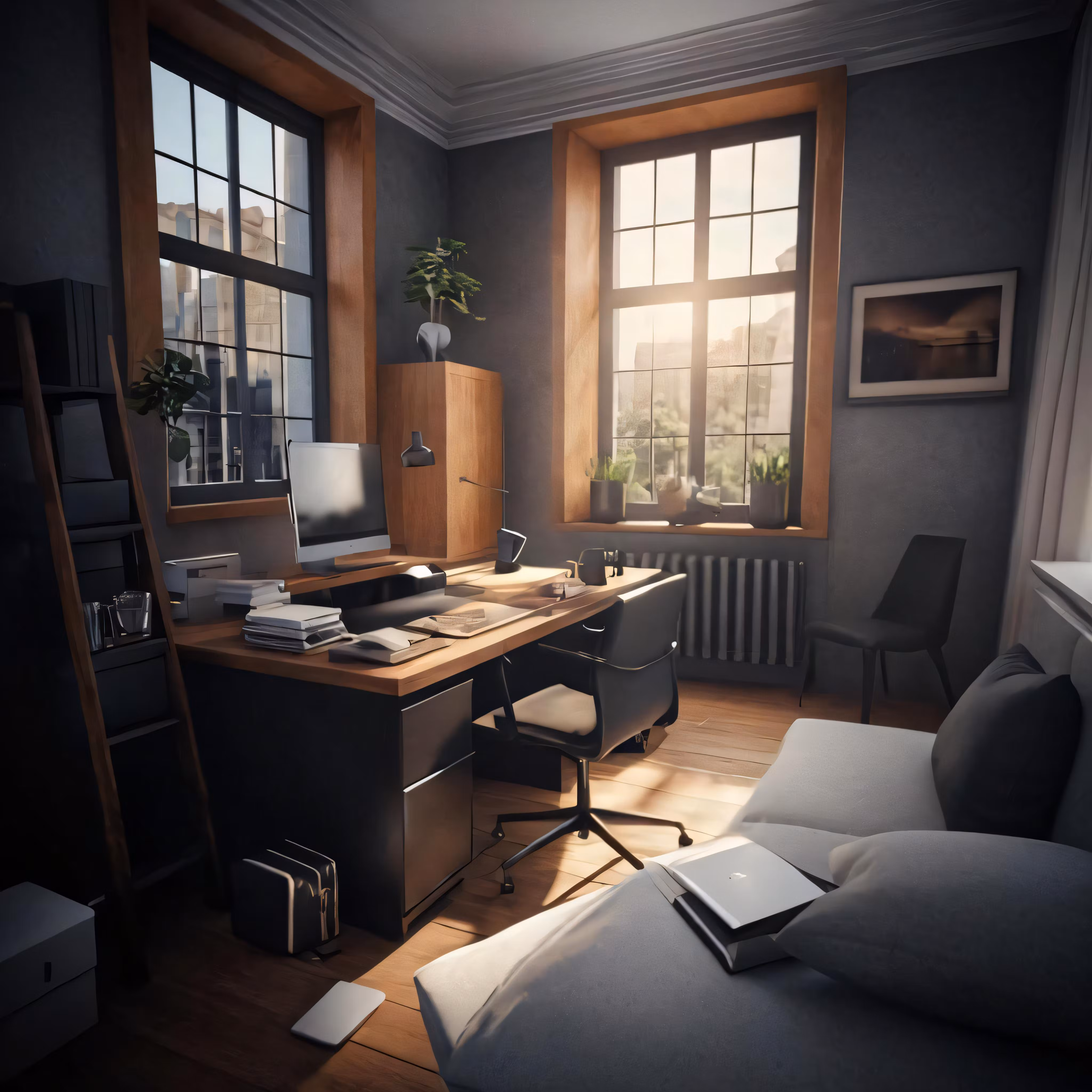 High resolution picture, free to use, the desk in the room is empty, and there is an empty chair