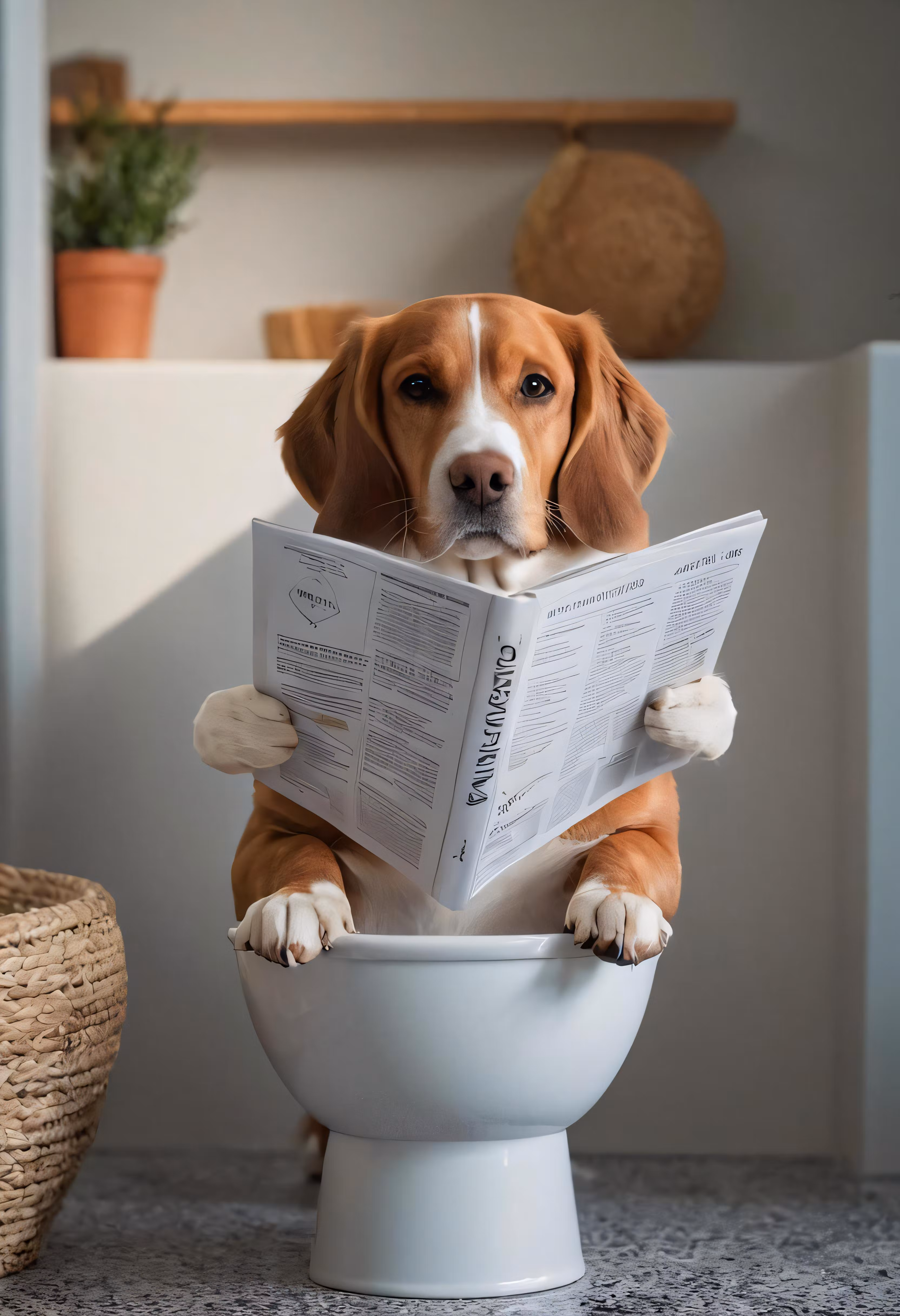High resolution picture, free to use, the dog is holding onto an open book on the toilet