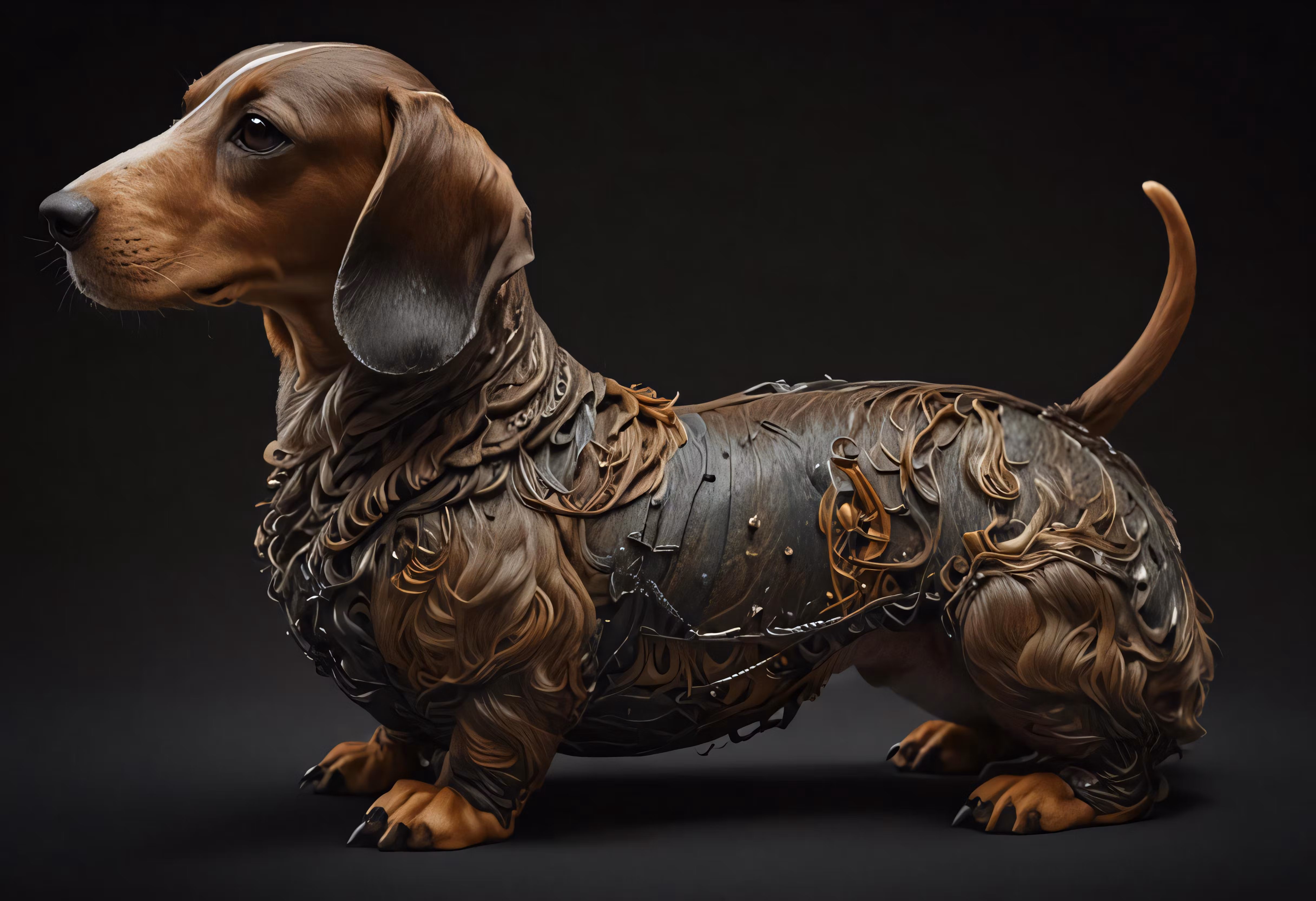 High resolution picture, free to use, the dog statue is decorated with chains and a harness