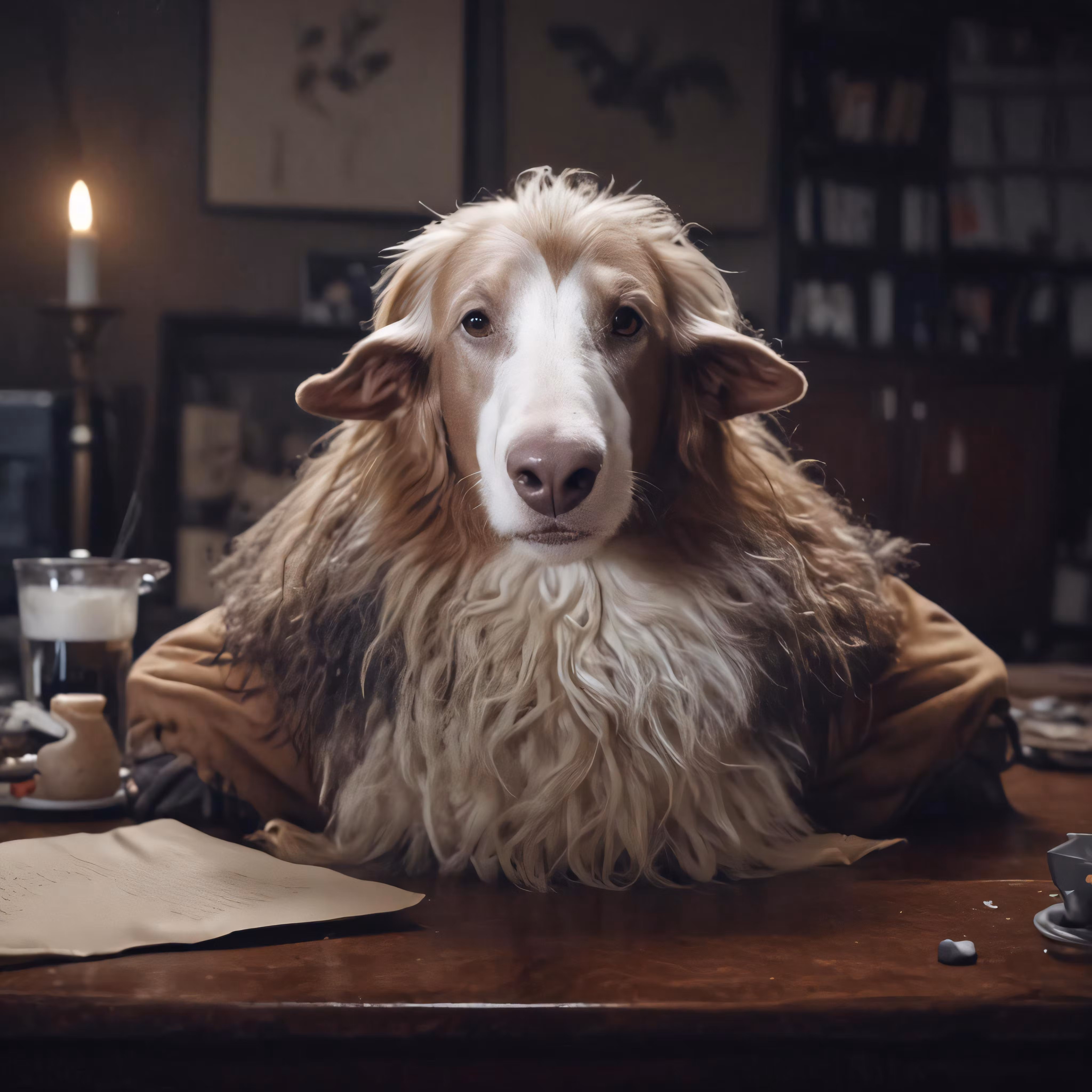 High resolution picture, free to use, the dog with a white face sits in front of some papers on a table