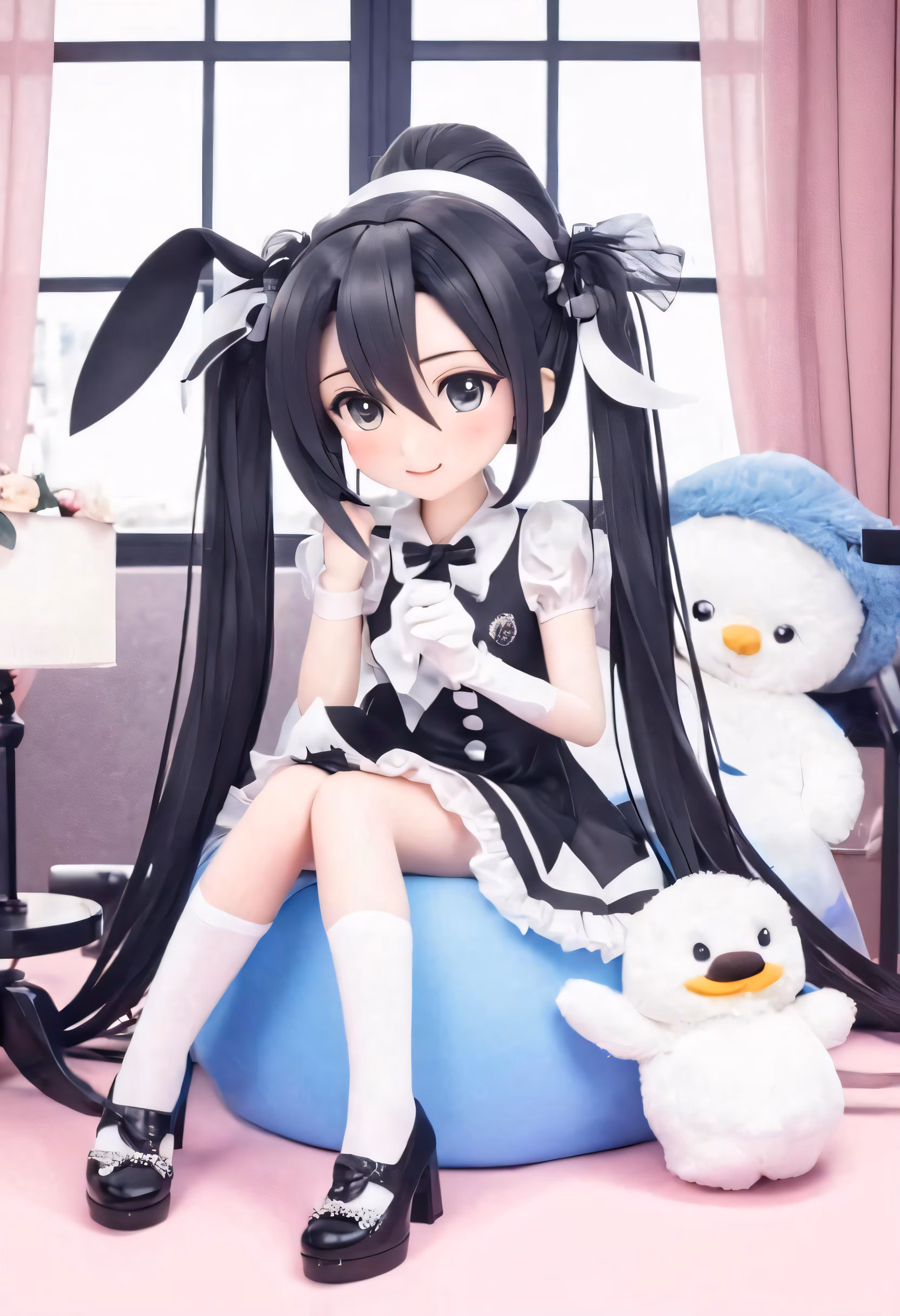 High resolution picture, free to use, the doll is sitting on top of a pillow with some stuffed animals
