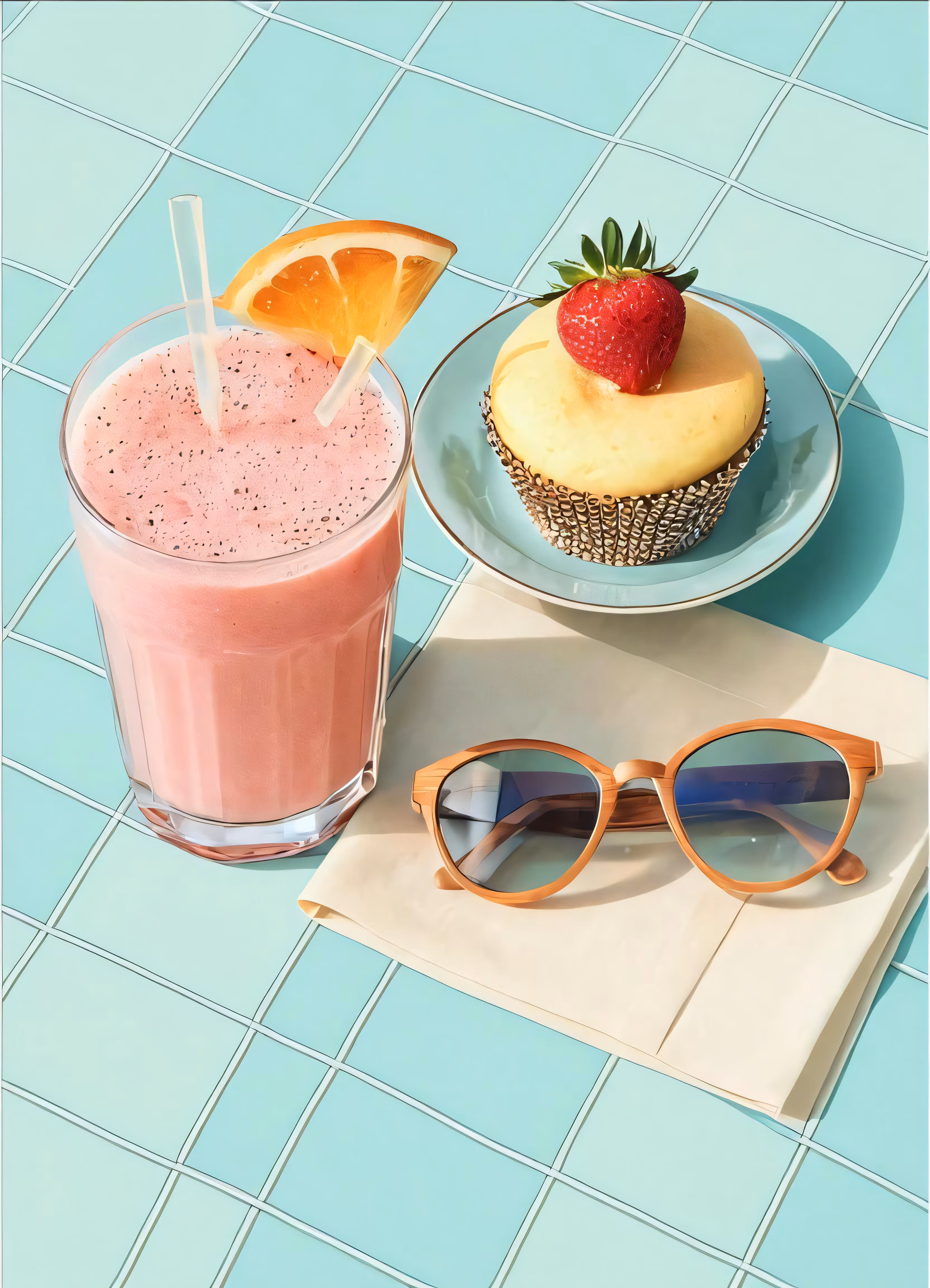 High resolution picture, free to use, the drink is next to the sunglasses on the table