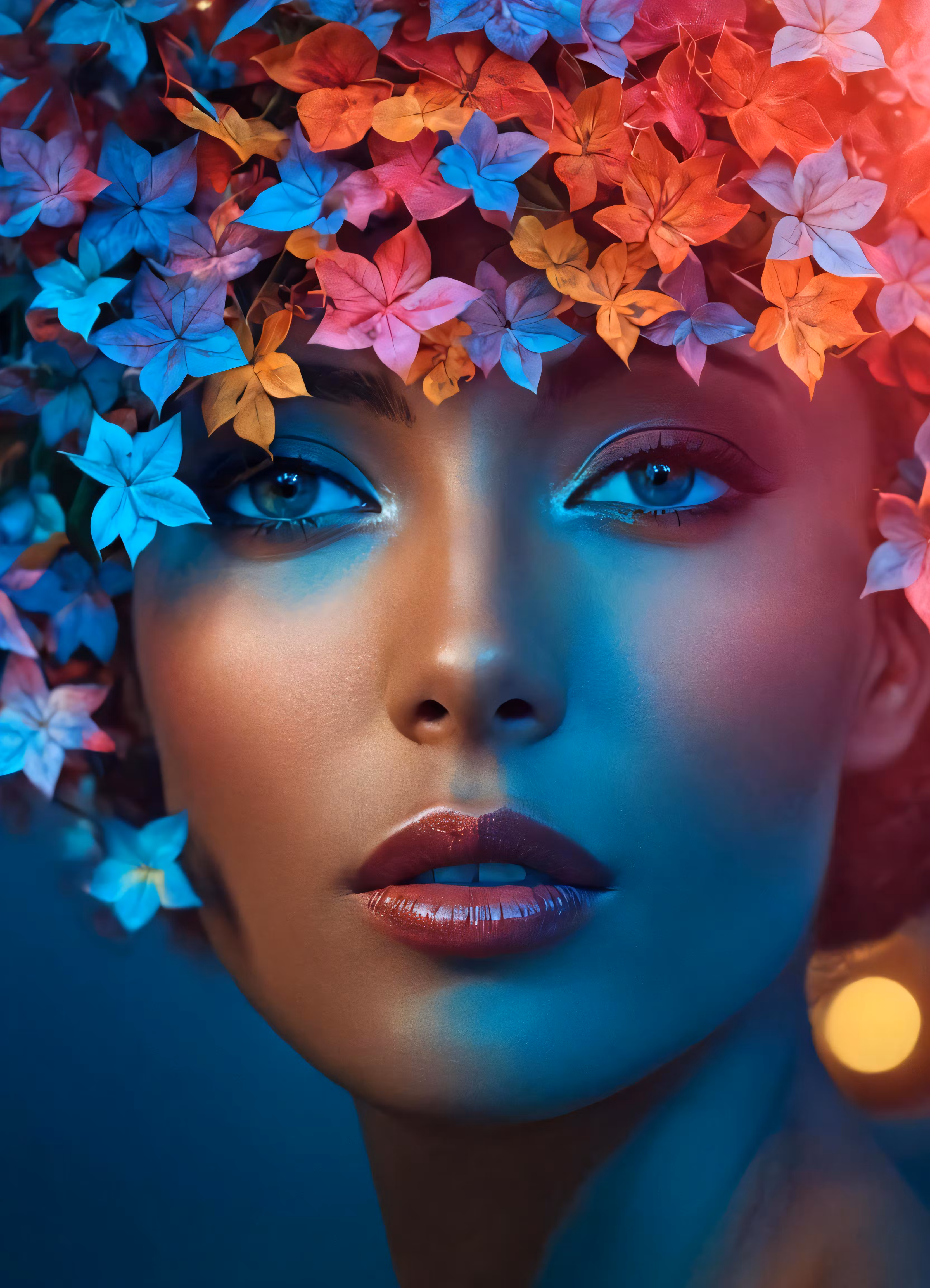 High resolution picture, free to use, the face and eye of a woman with brightly colored flowers in her hair