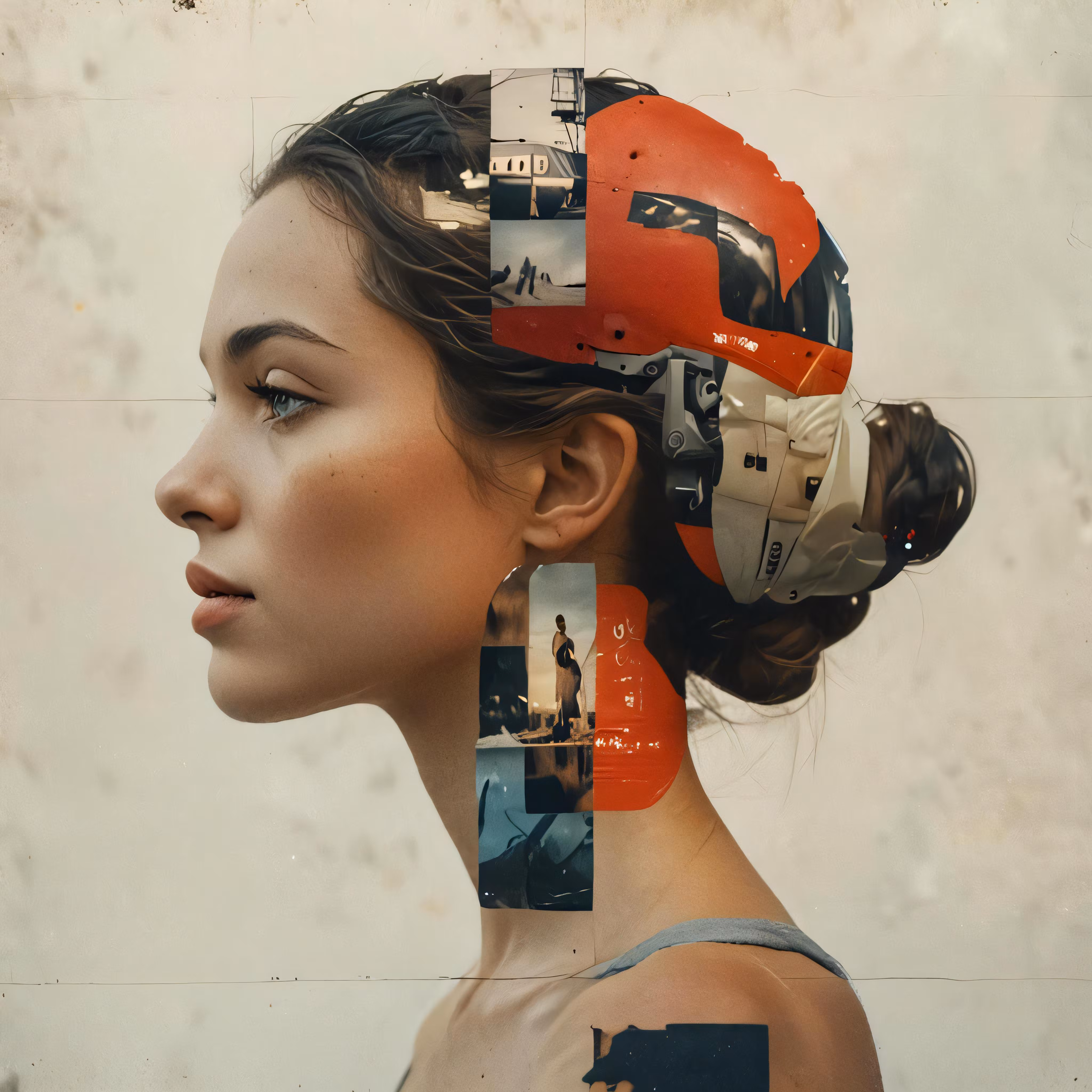 High resolution picture, free to use, the face of a woman has photos arranged on her head