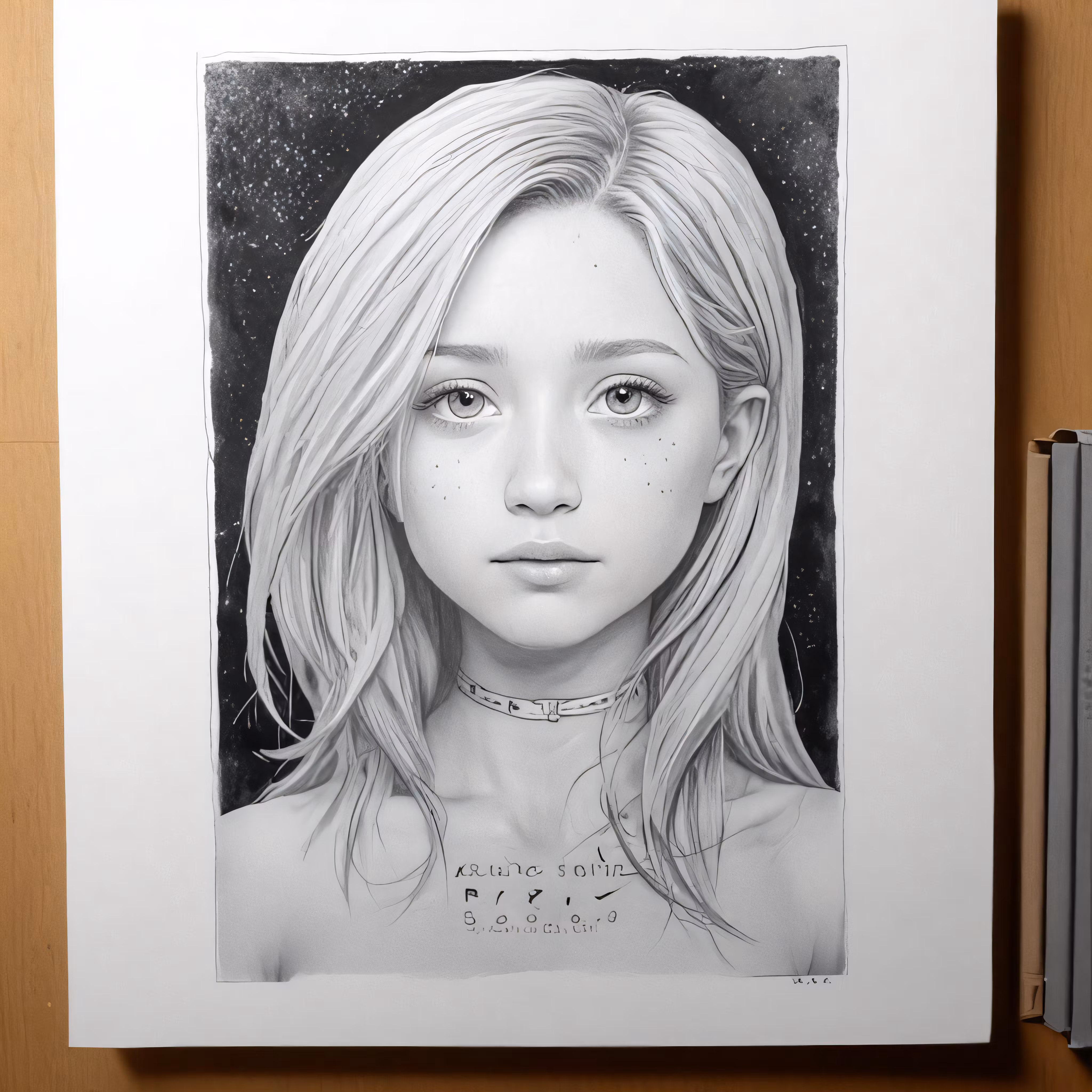 High resolution picture, free to use, the face of a young girl, is drawn in pencil