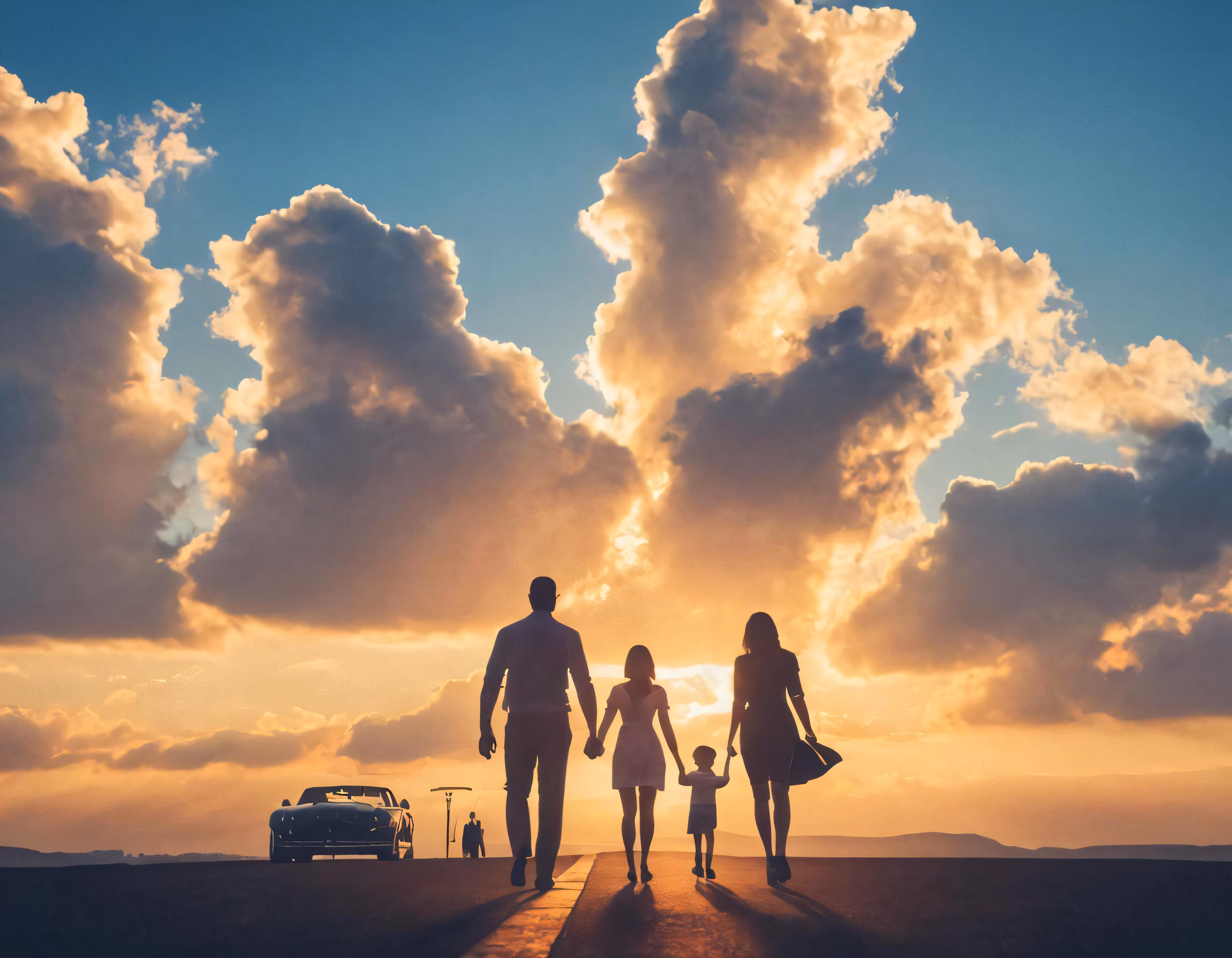 High resolution picture, free to use, the family is walking towards the car on the road