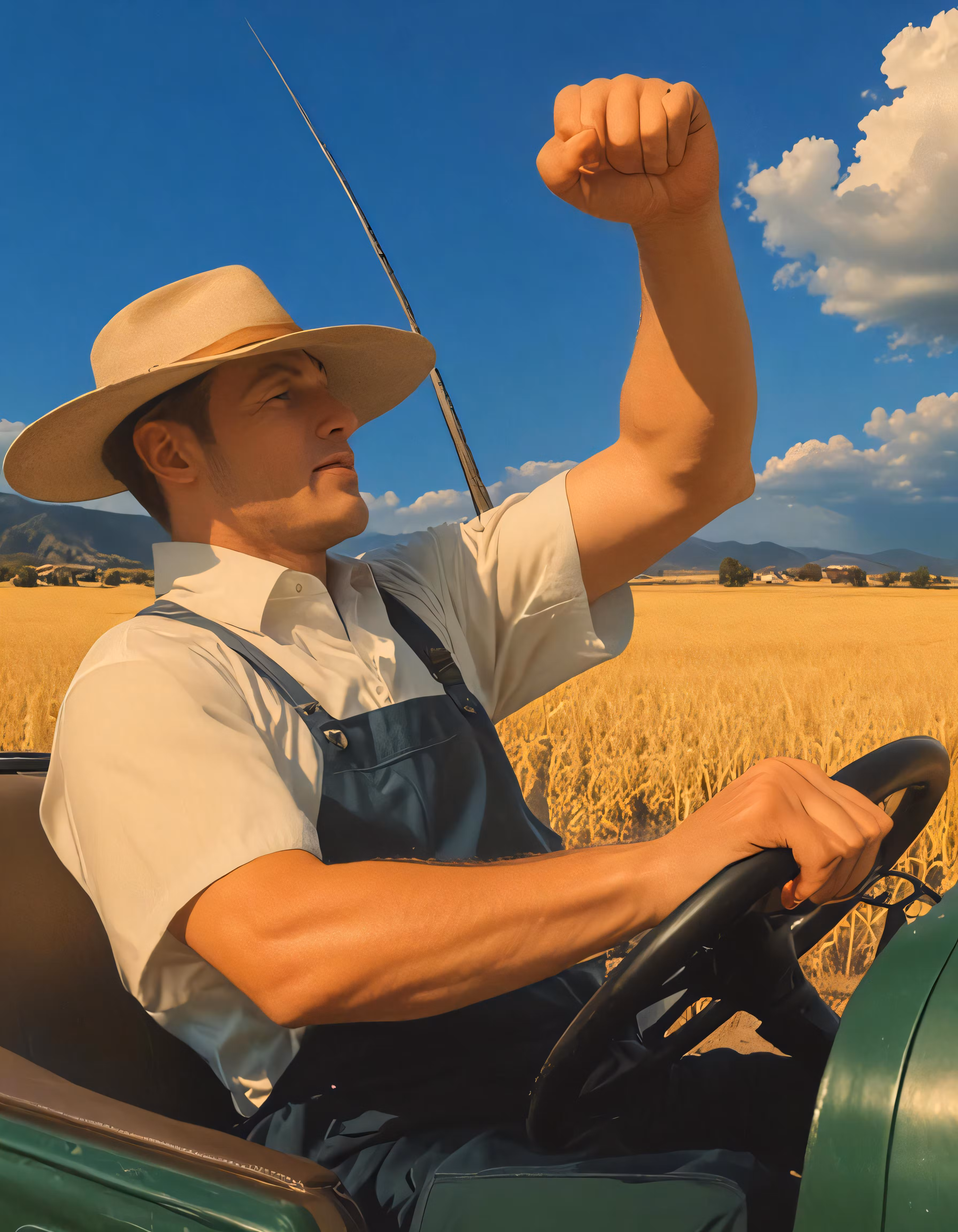 High resolution picture, free to use, the farmer is driving his tractor and holding on to some rods