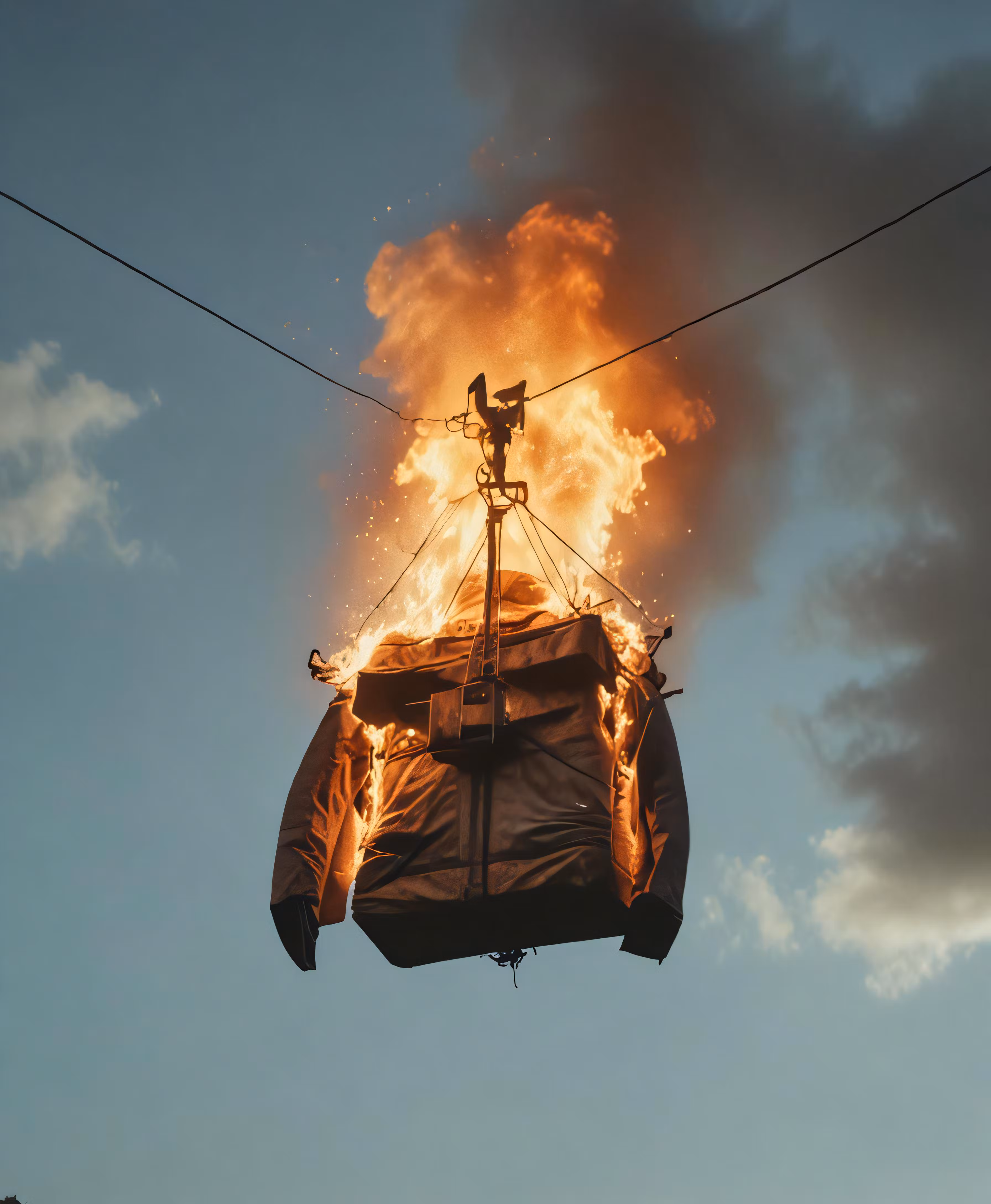 High resolution picture, free to use, the flames burn outside as a man prepares to climb
