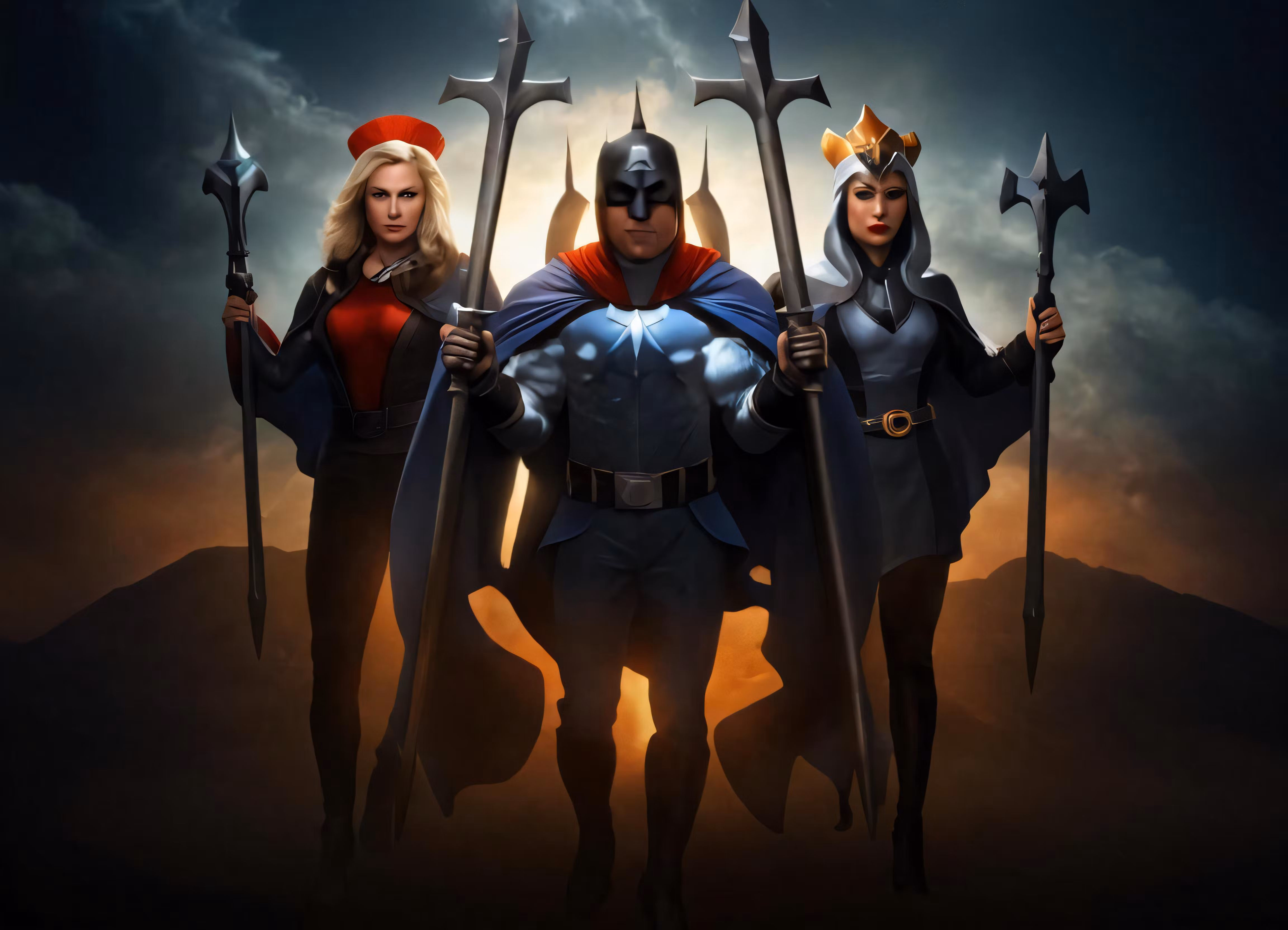 High resolution picture, free to use, the four wonder women stand in front of an evil sky