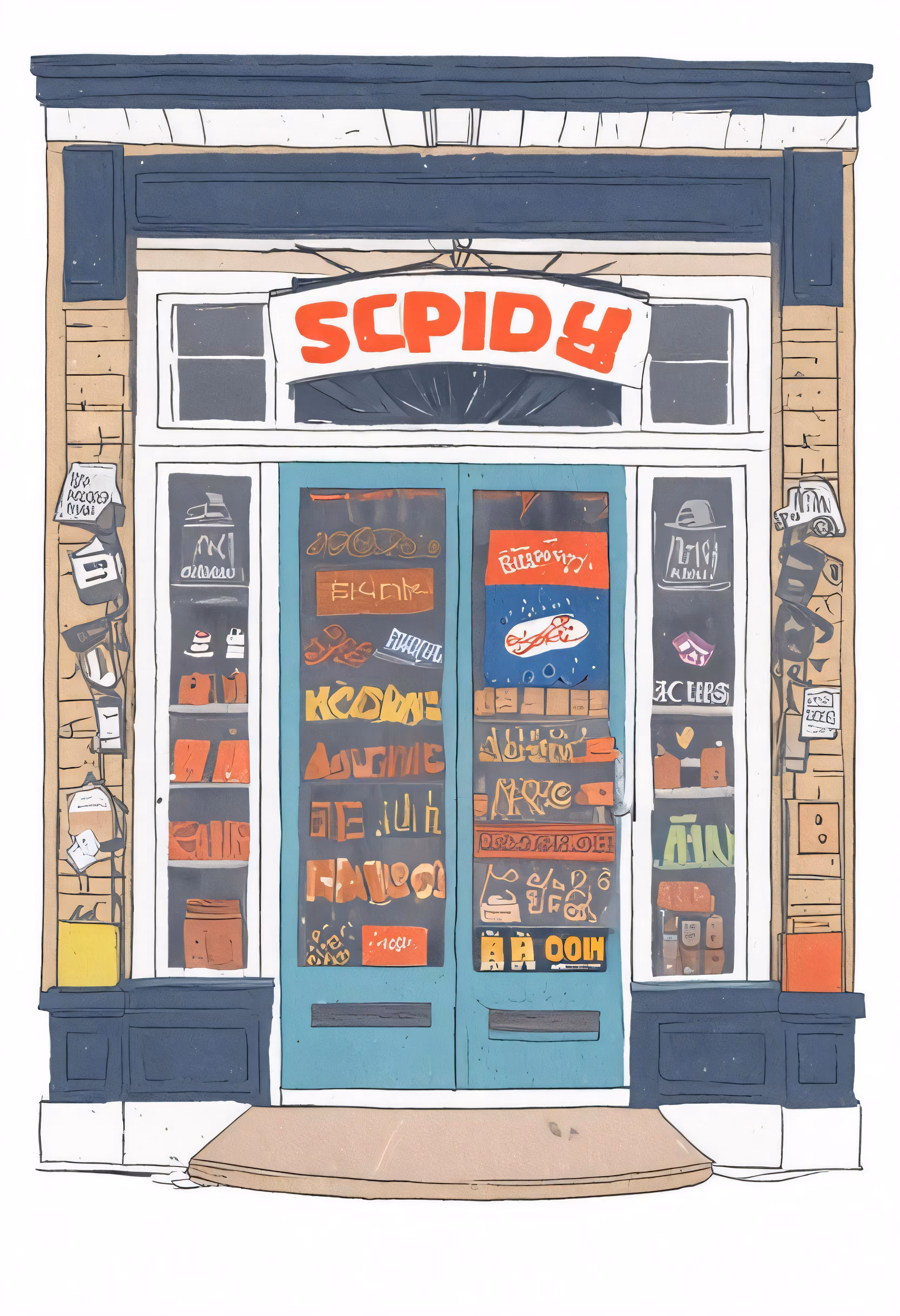 High resolution picture, free to use, the front of a building with a window that has a lot of signs on it