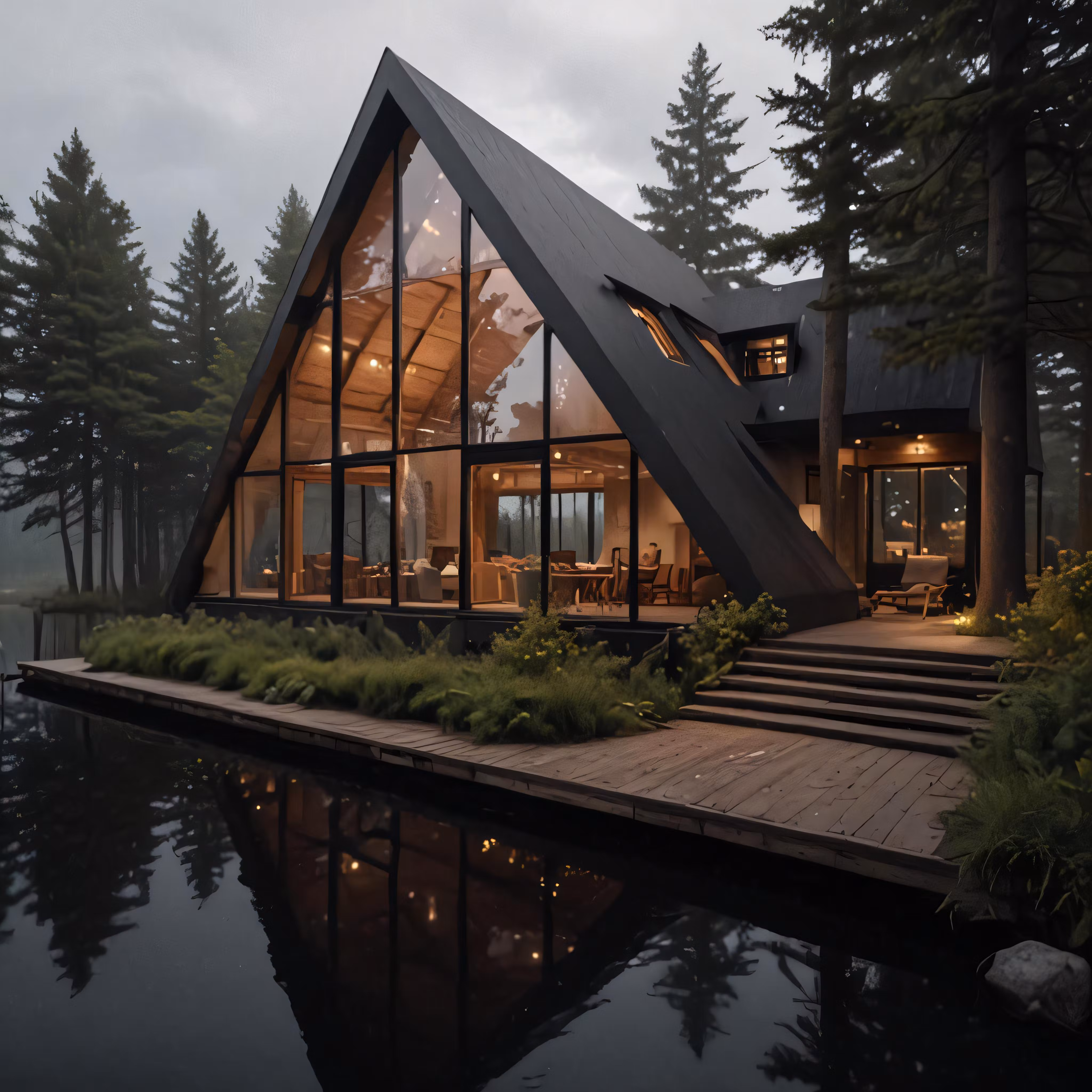 High resolution picture, free to use, the front of the modern house, which has windows and a walkway that leads up to the water