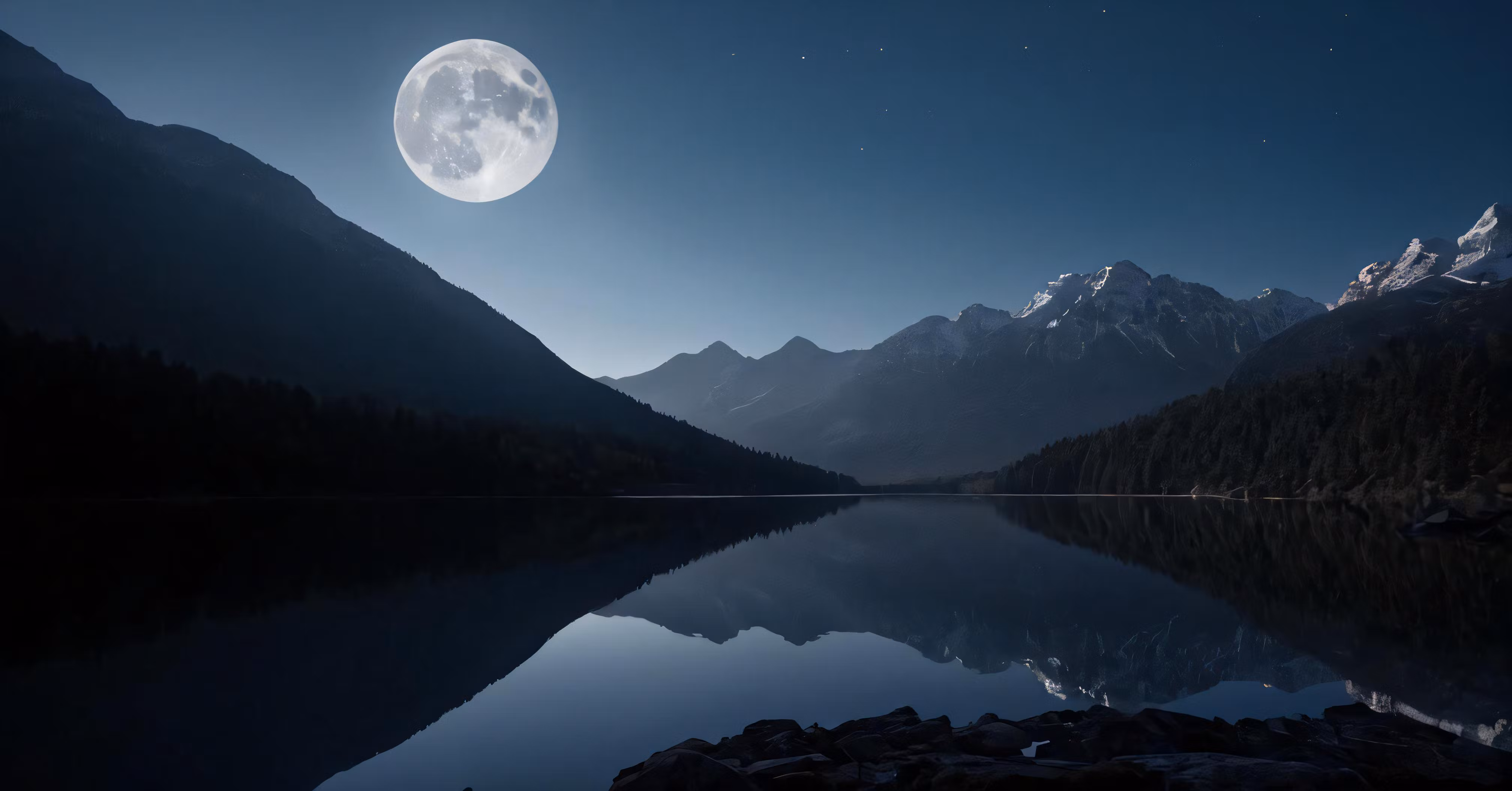 High resolution picture, free to use, the full moon rises above some mountains and a mountain lake
