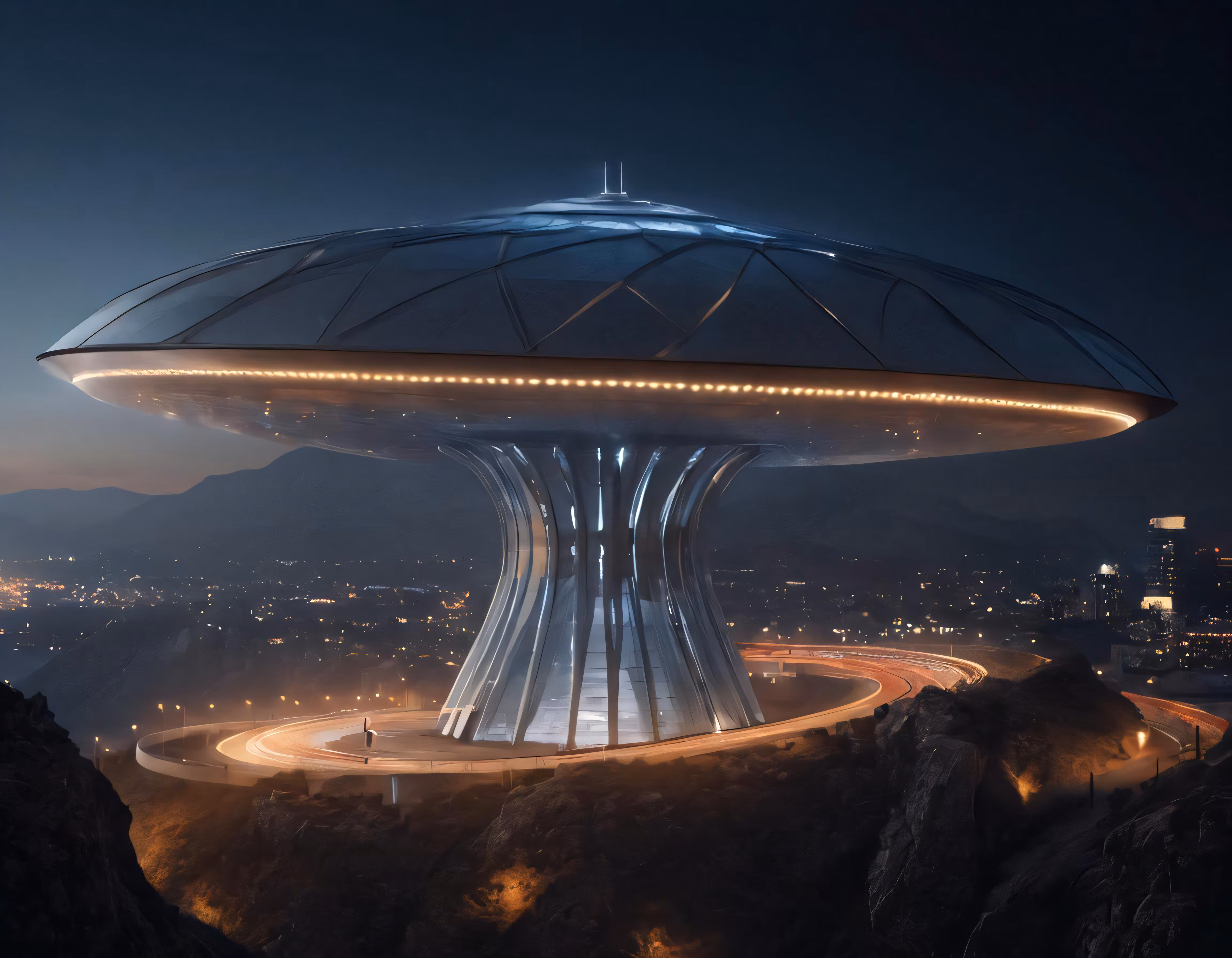 High resolution picture, free to use, the futuristic structure is on top of a mountain at night