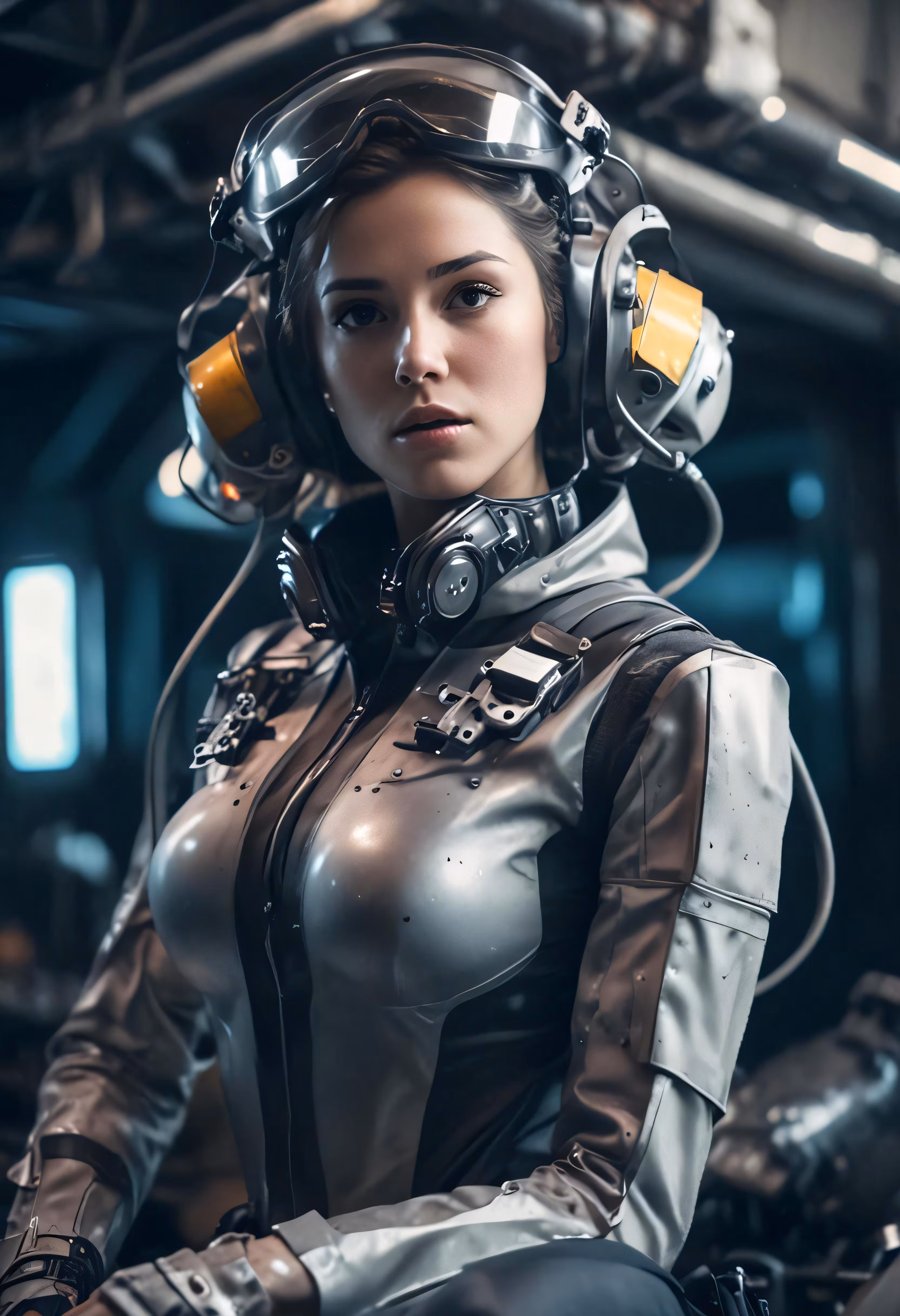 High resolution picture, free to use, the futuristic woman is sitting down wearing a helmet and goggles