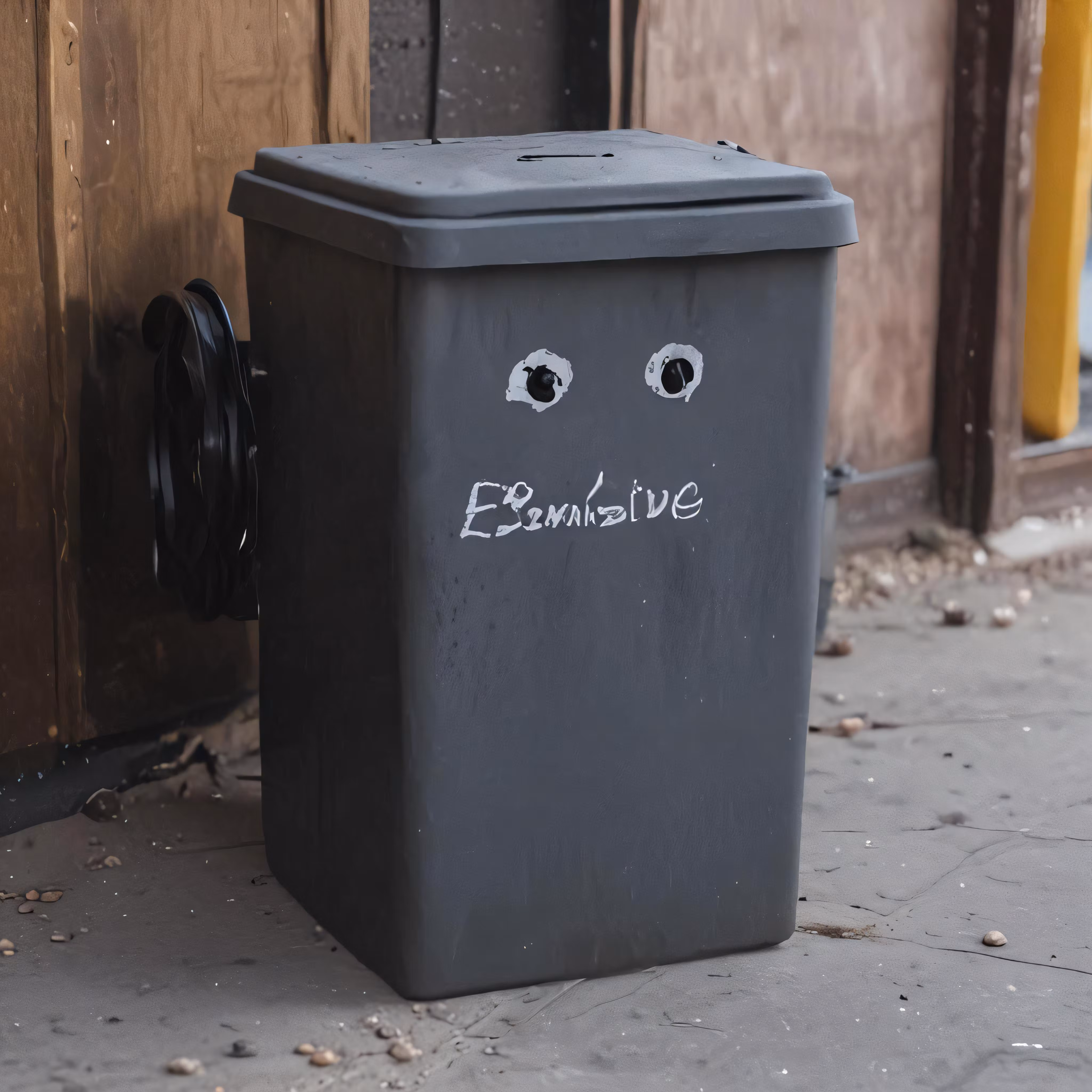 High resolution picture, free to use, the garbage can is outside and has drawn eyes