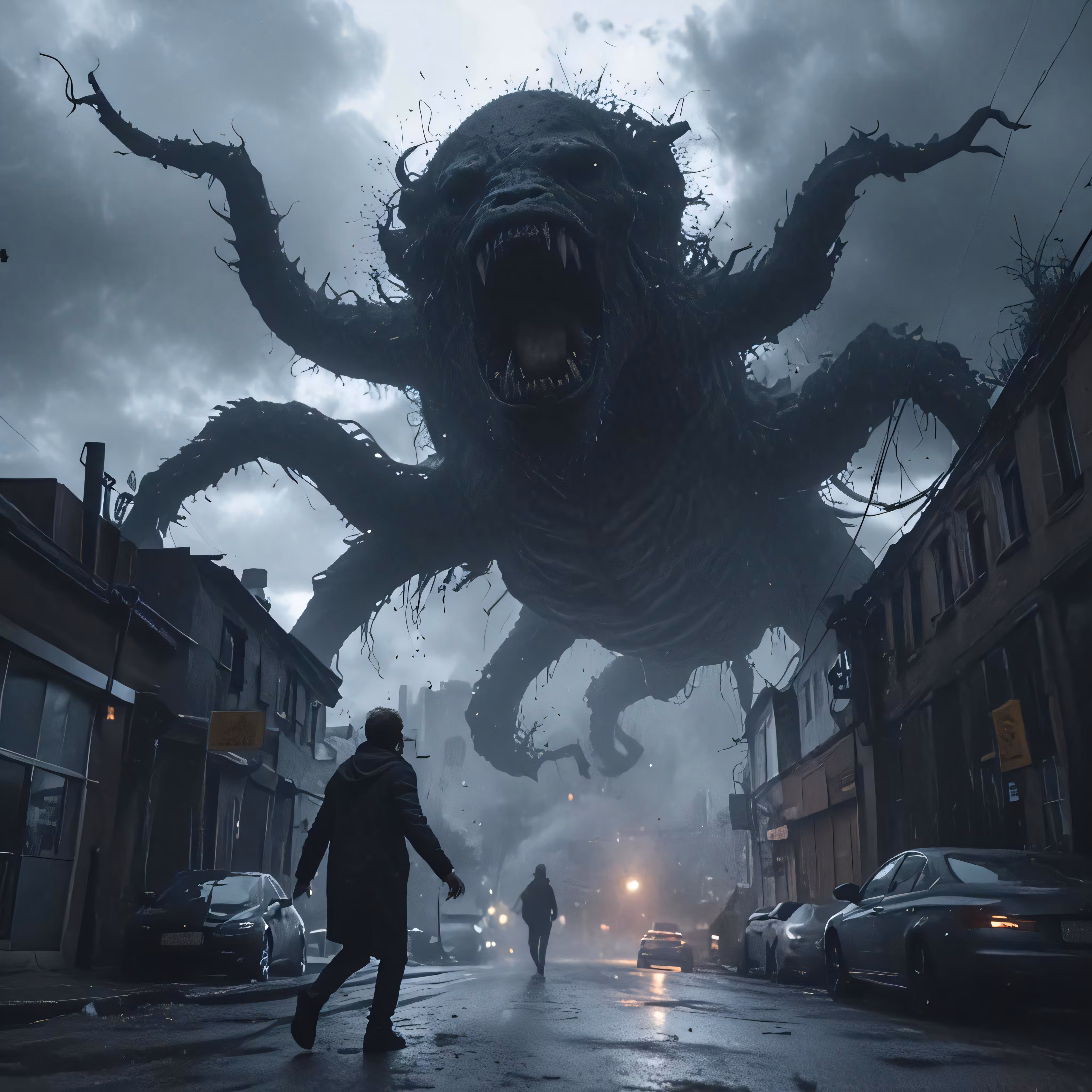 High resolution picture, free to use, the giant squid character stands in front of two people on a wet street