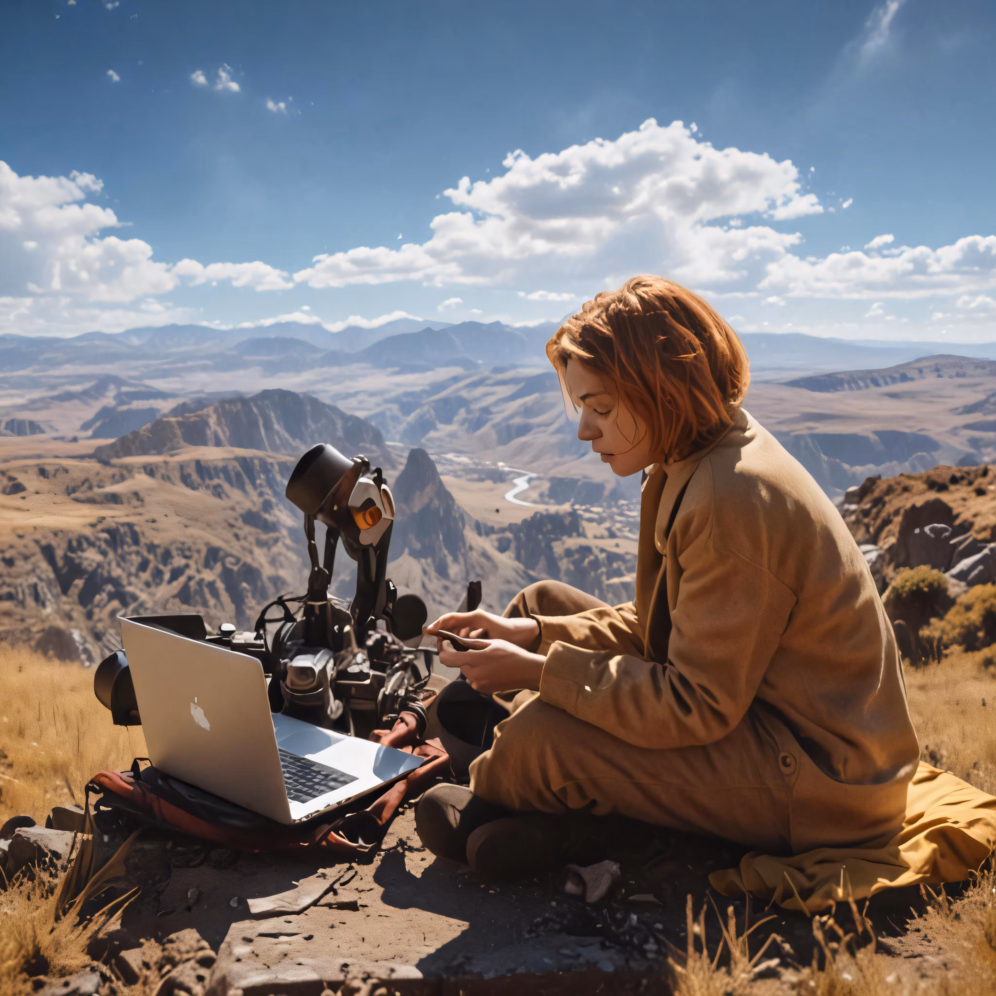 High resolution picture, free to use, the girl is sitting on the hill with her laptop