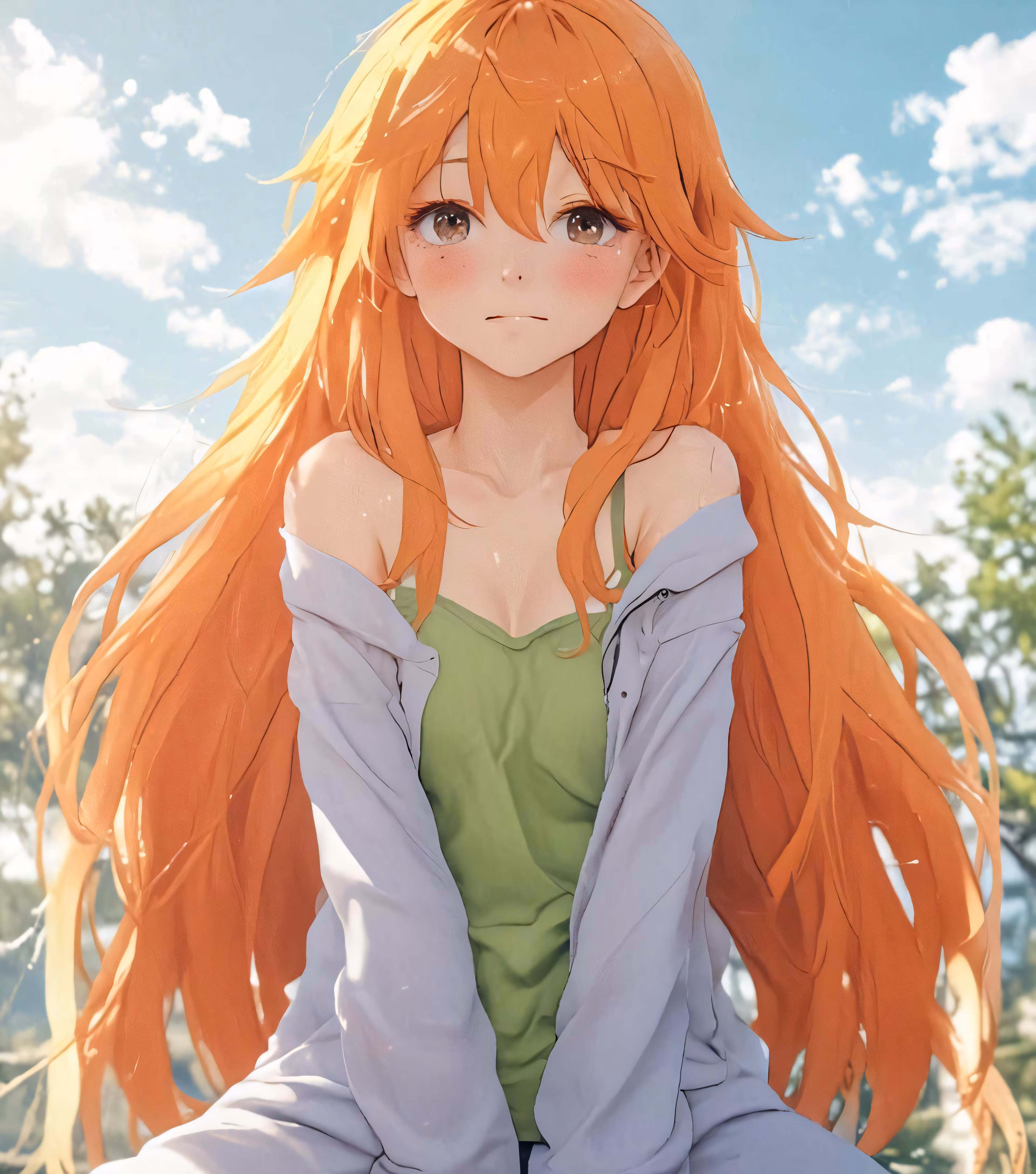High resolution picture, free to use, the girl with long orange hair sitting down