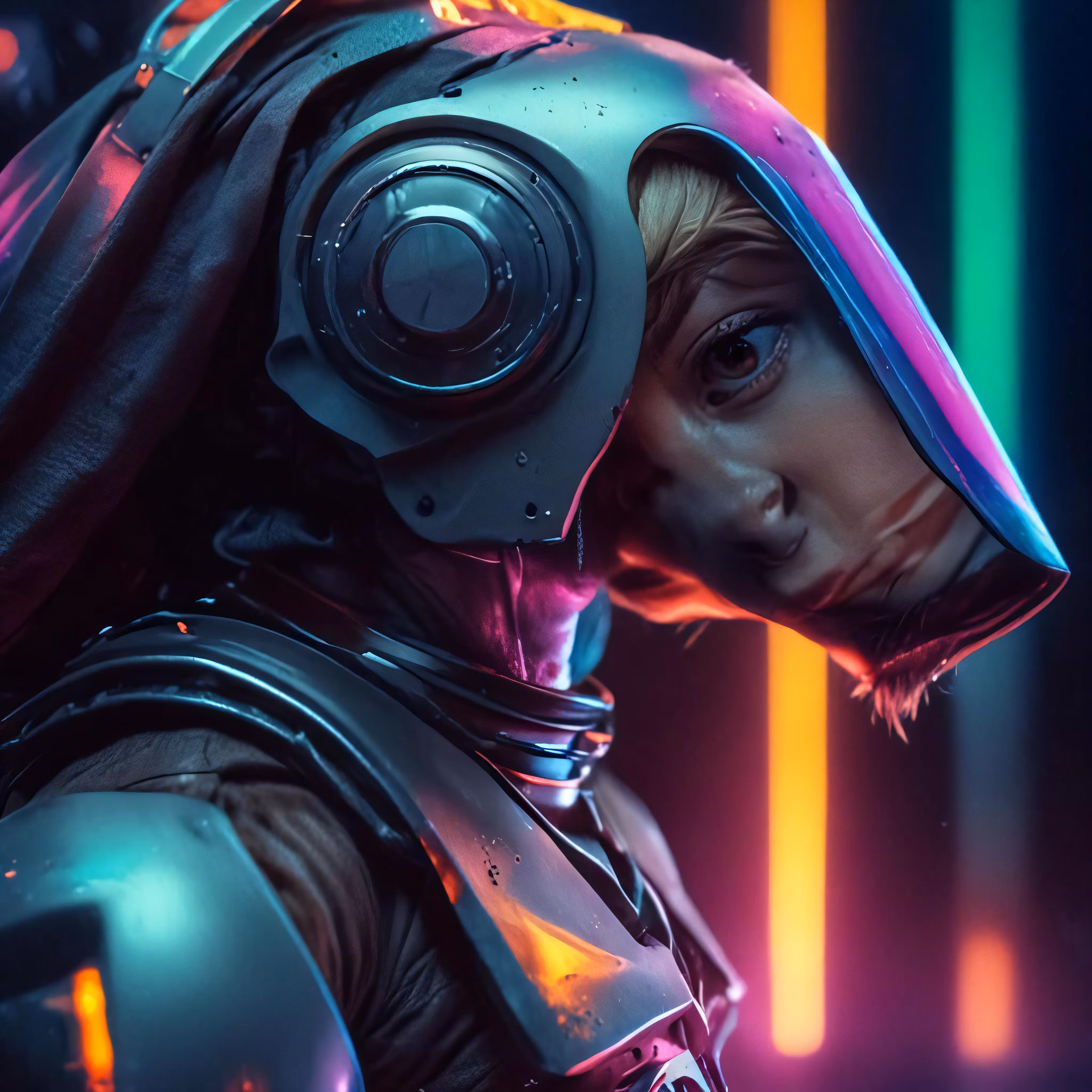 High resolution picture, free to use, the head and shoulders of a futuristic woman in a space suit with bright neon lines
