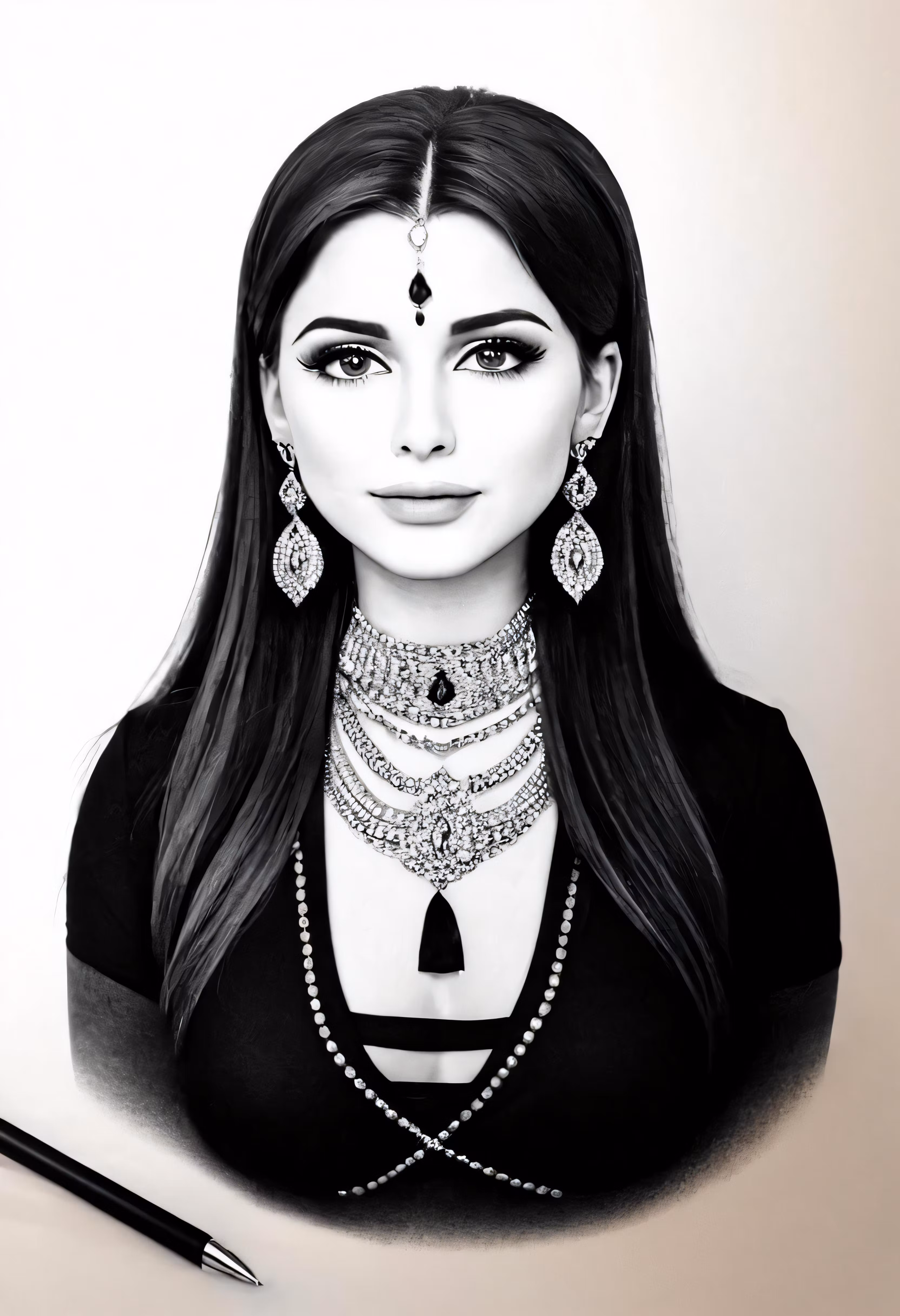 High resolution picture, free to use, the head and shoulders of a young woman wearing choker, necklaces, and pearls and two pairs of diamond earrings