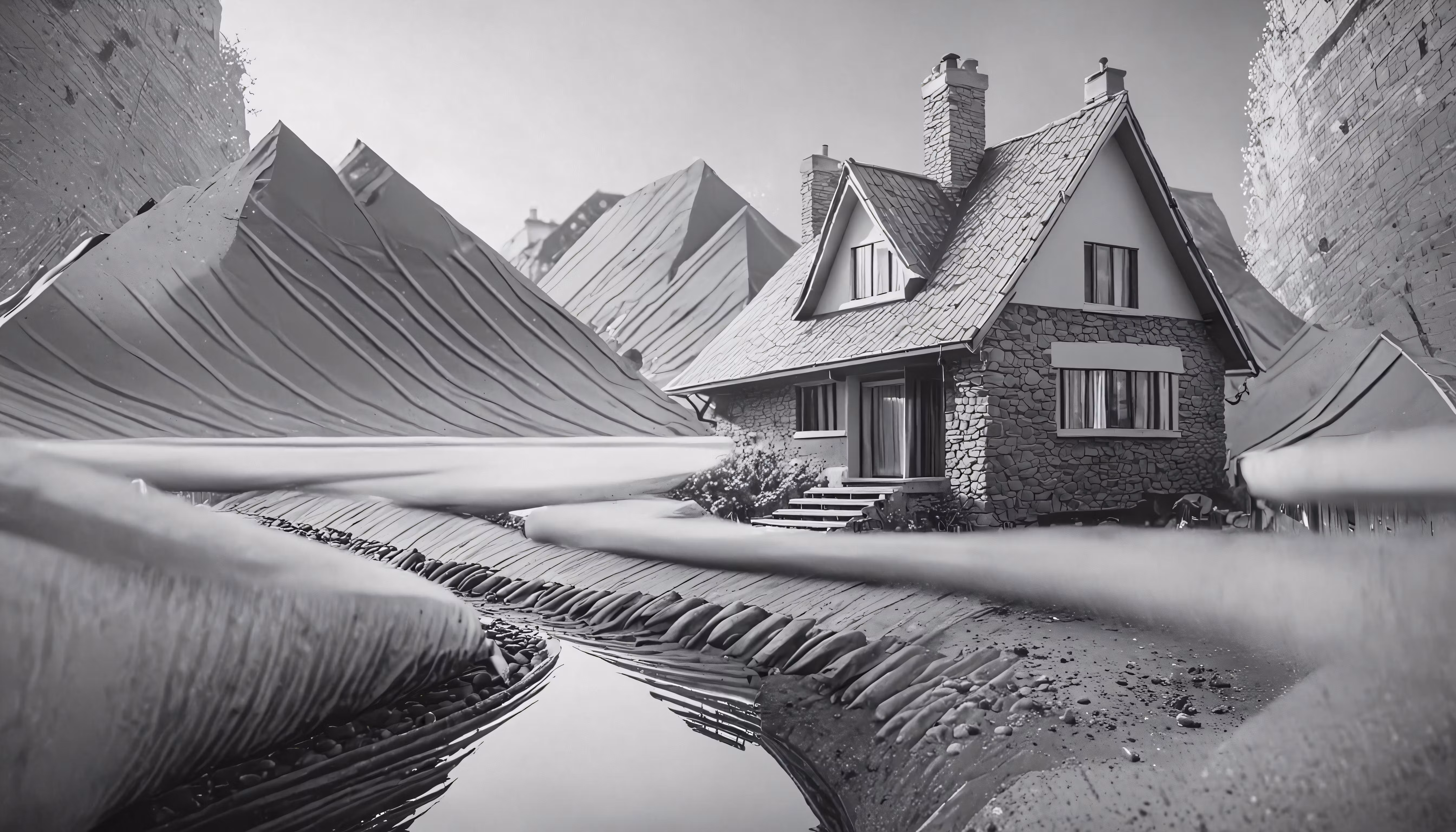 High resolution picture, free to use, the house with an unusual roof stands beside a stream
