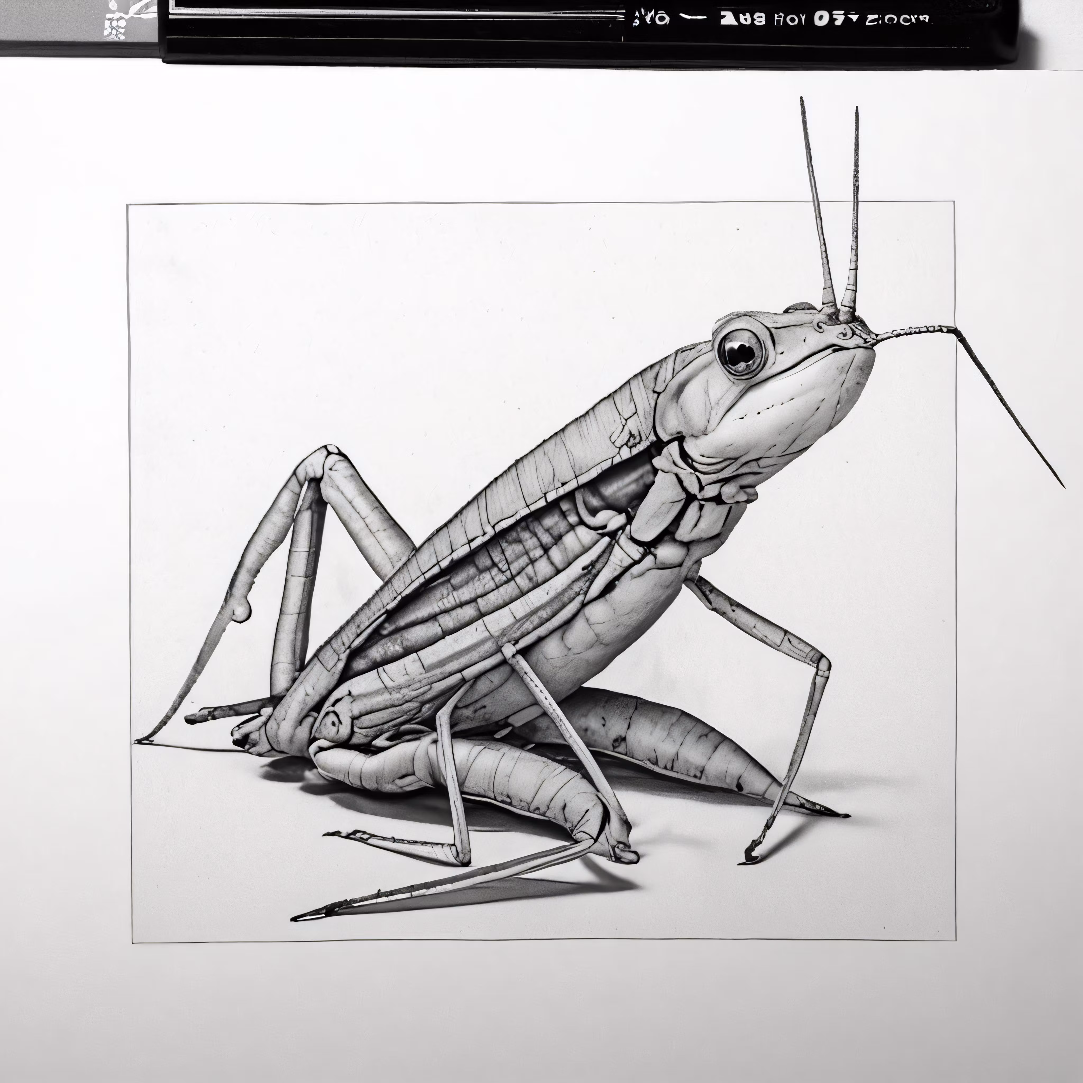 High resolution picture, free to use, the image of a praying mantissa on paper next to some crayons