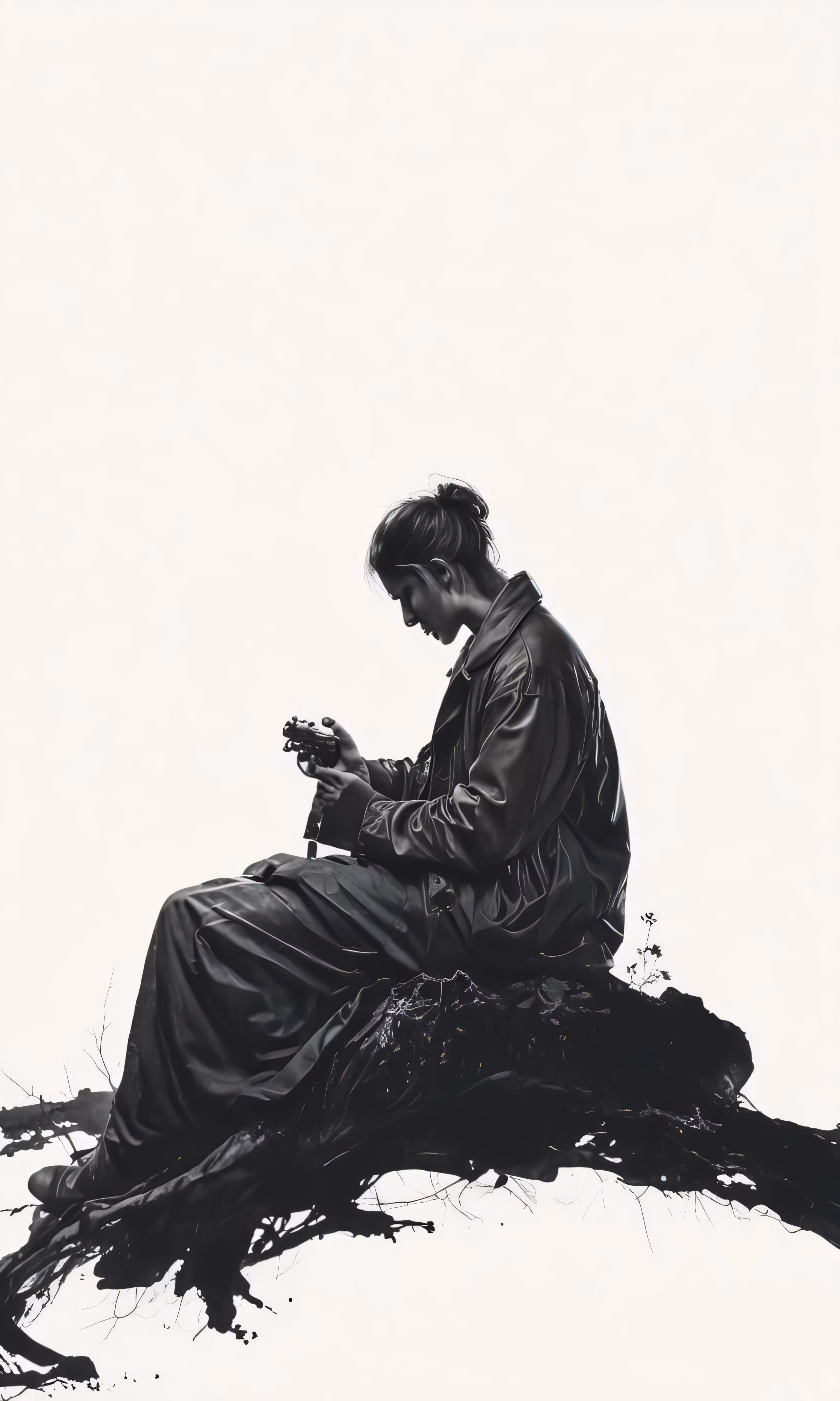 High resolution picture, free to use, the image shows a man sitting on a tree branch and looking at his cell phone