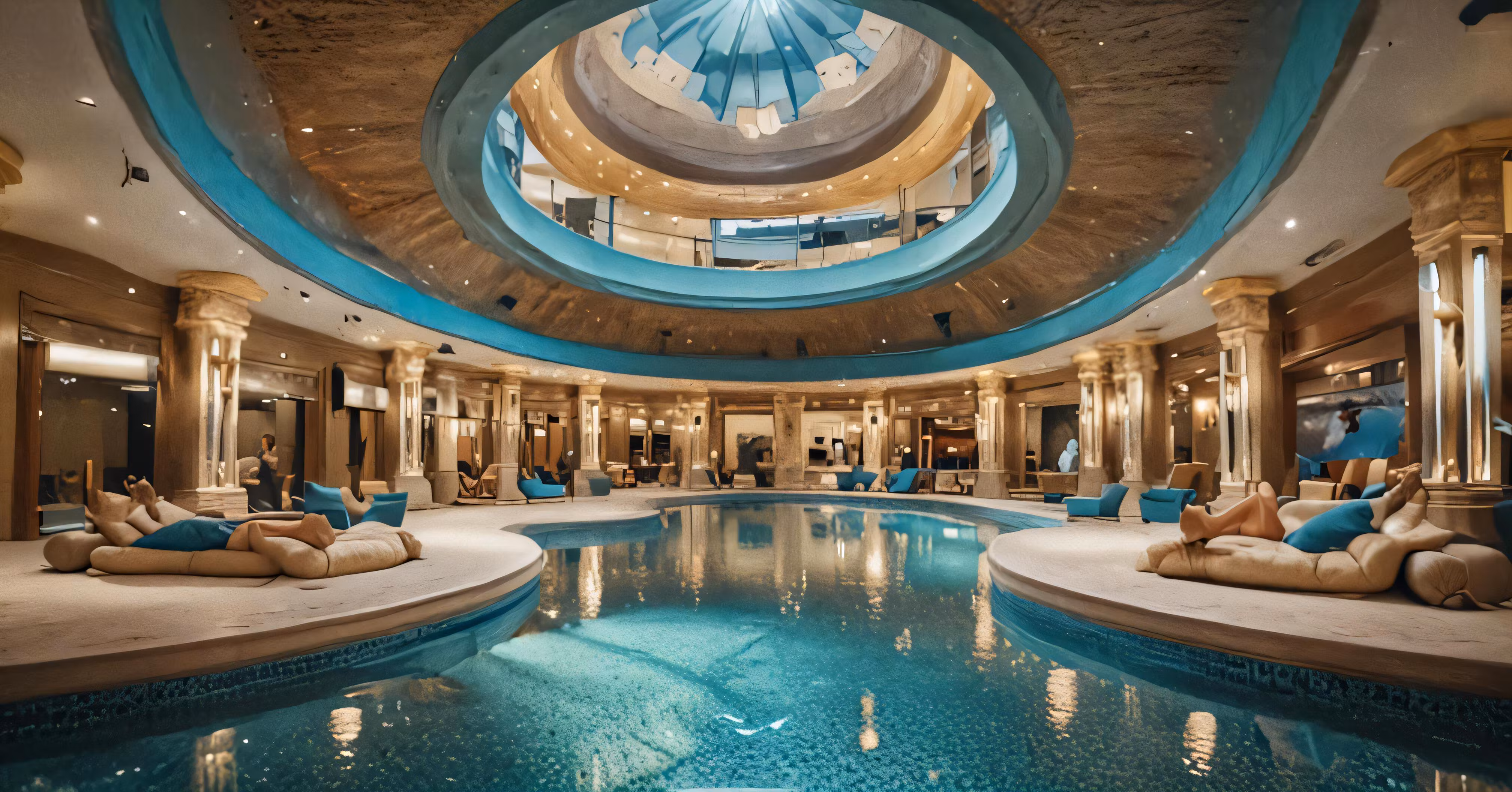 High resolution picture, free to use, the indoor pool is surrounded by blue pillows