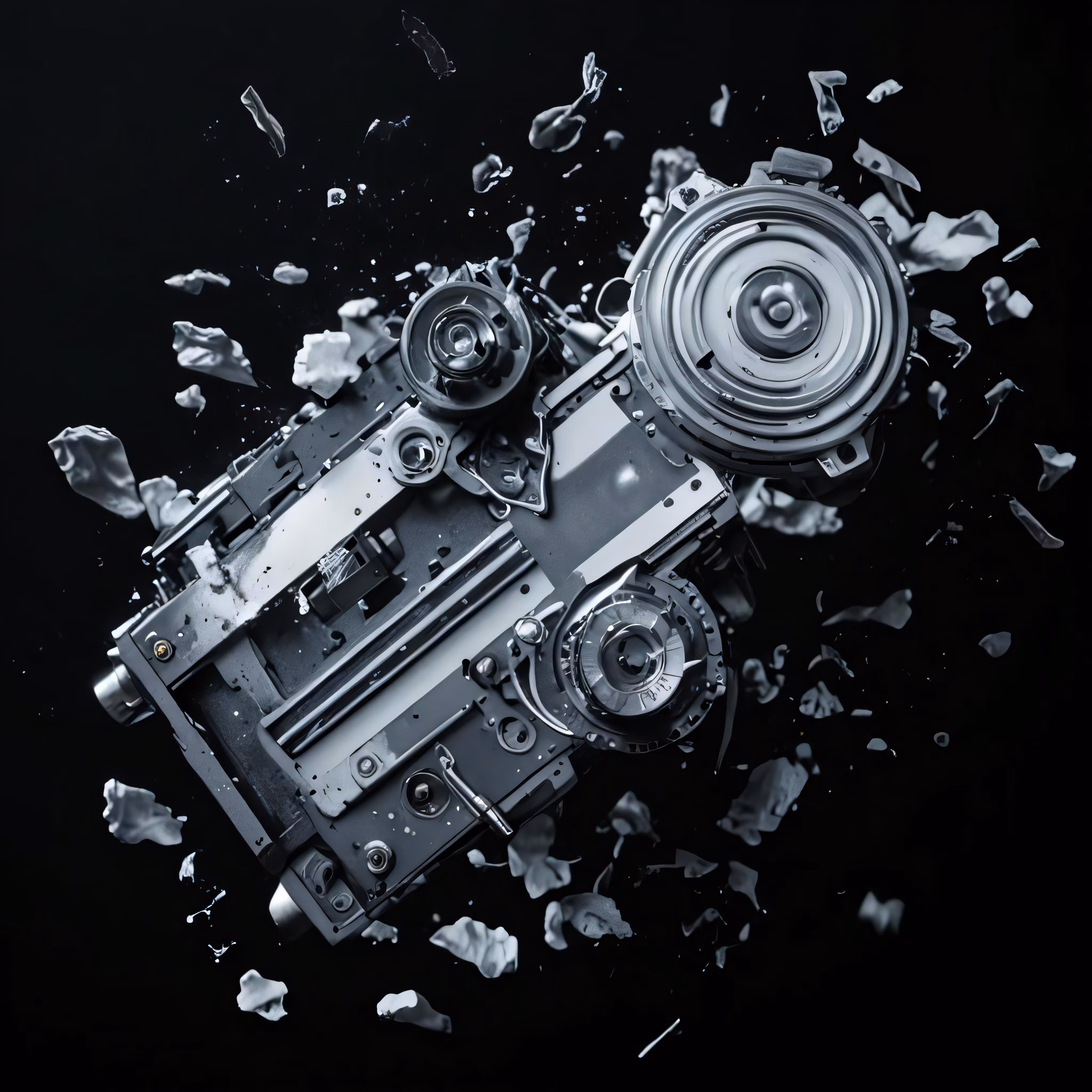 High resolution picture, free to use, the inside view of an antique typewriter surrounded by broken pieces