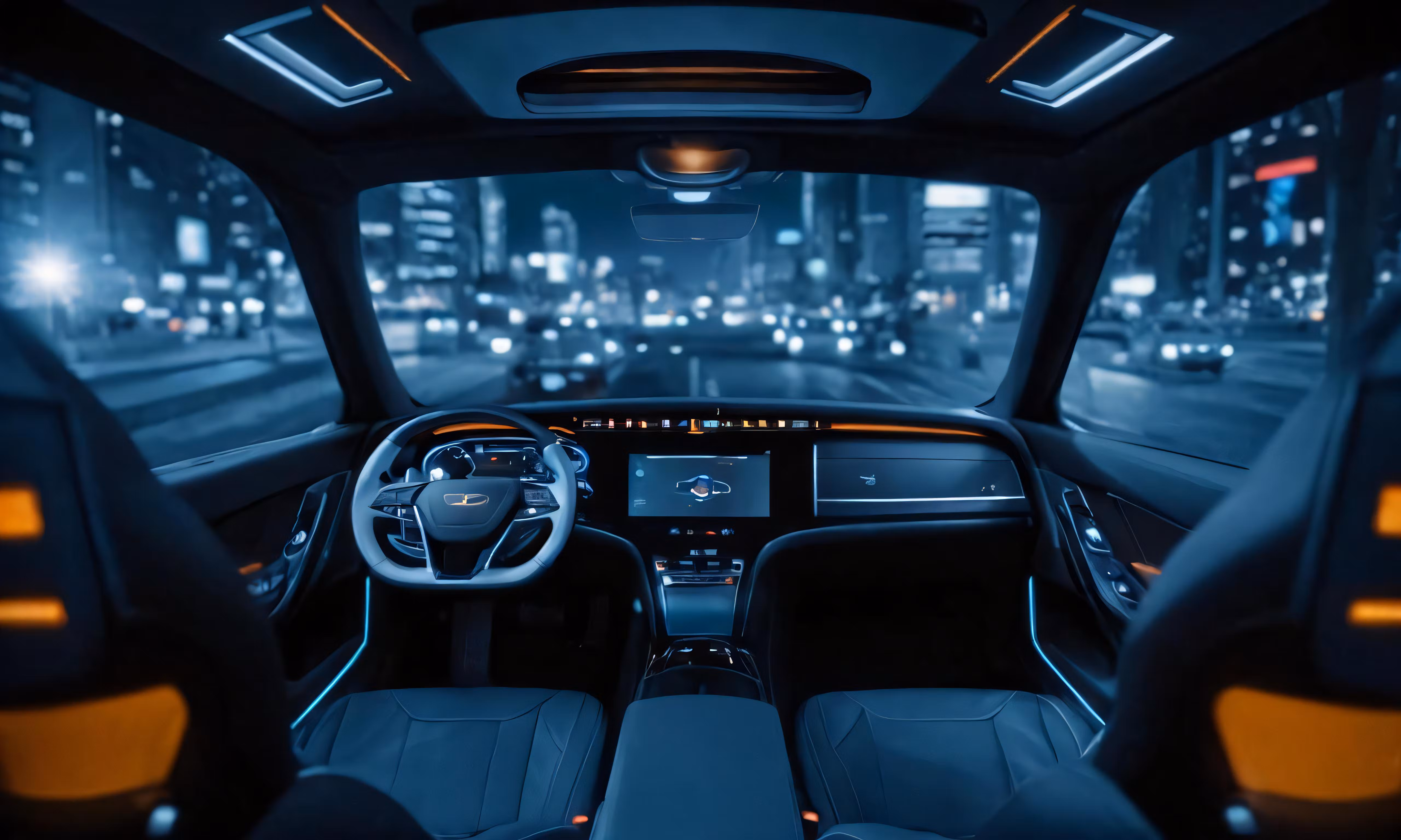 High resolution picture, free to use, the interior of a vehicle with a steering wheel, dashboard and touch screen displays