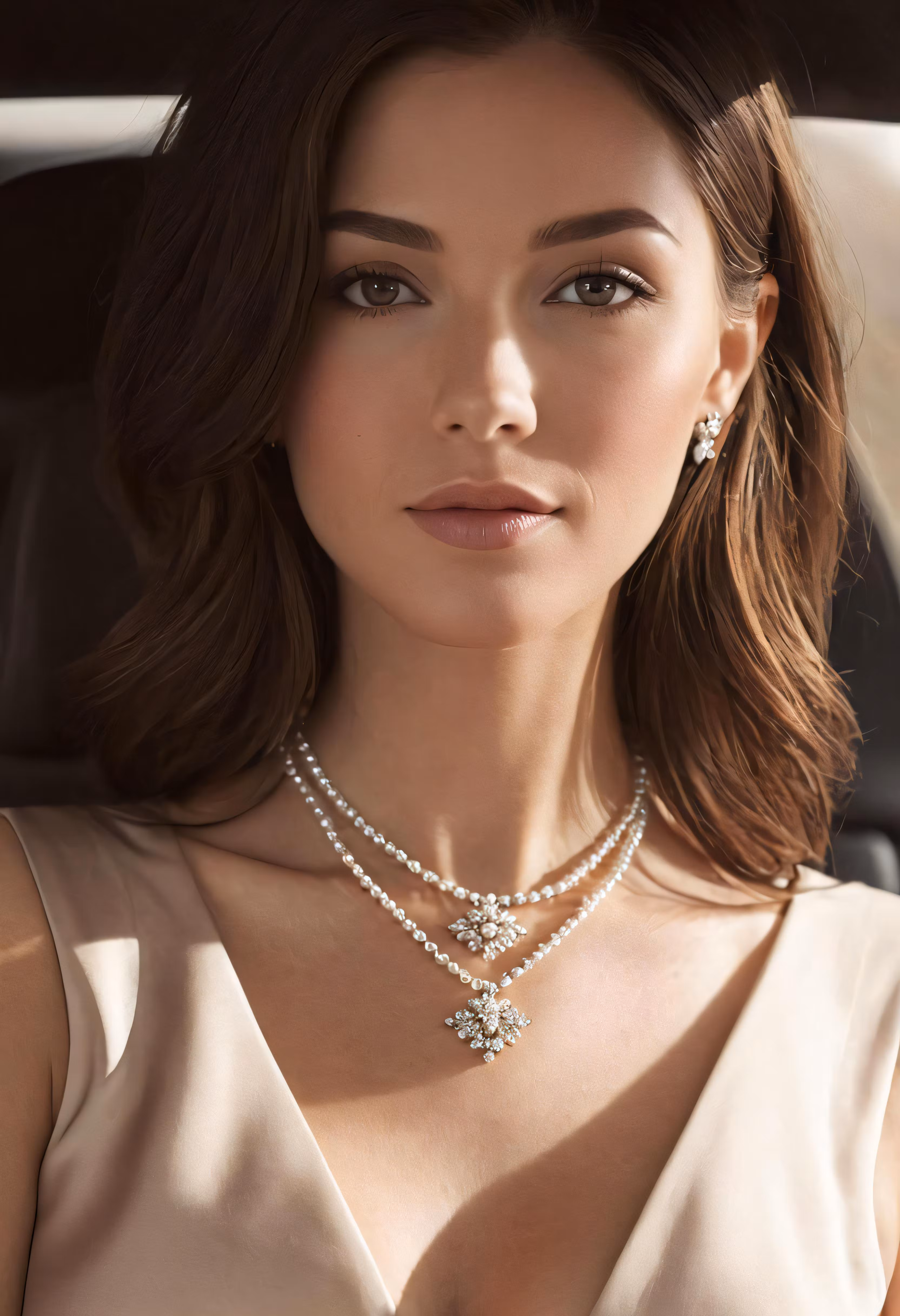 High resolution picture, free to use, the lady in a tan dress is wearing two necklaces on her neck