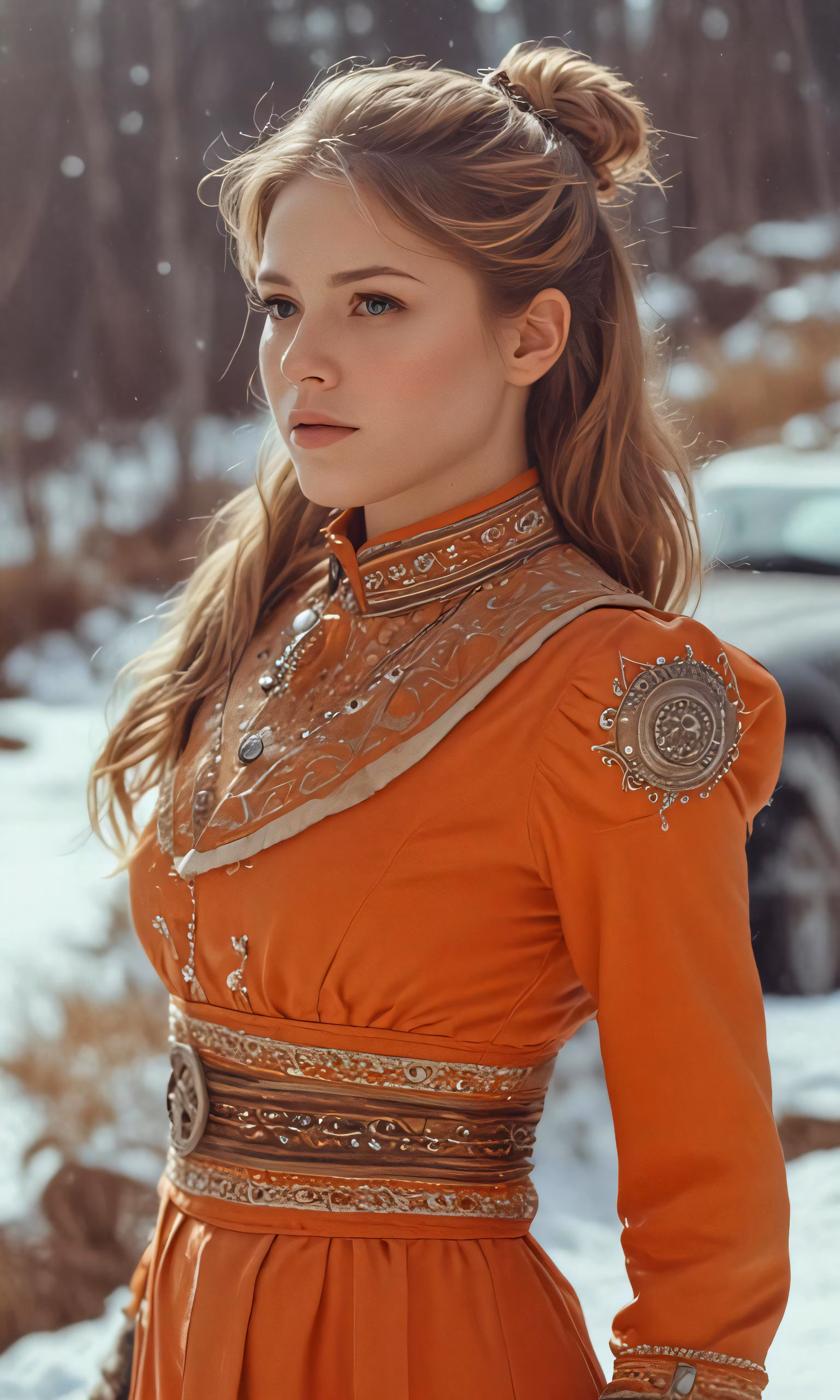 High resolution picture, free to use, the lady in the orange dress looks into the distance